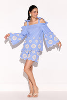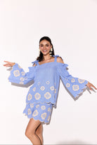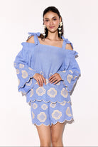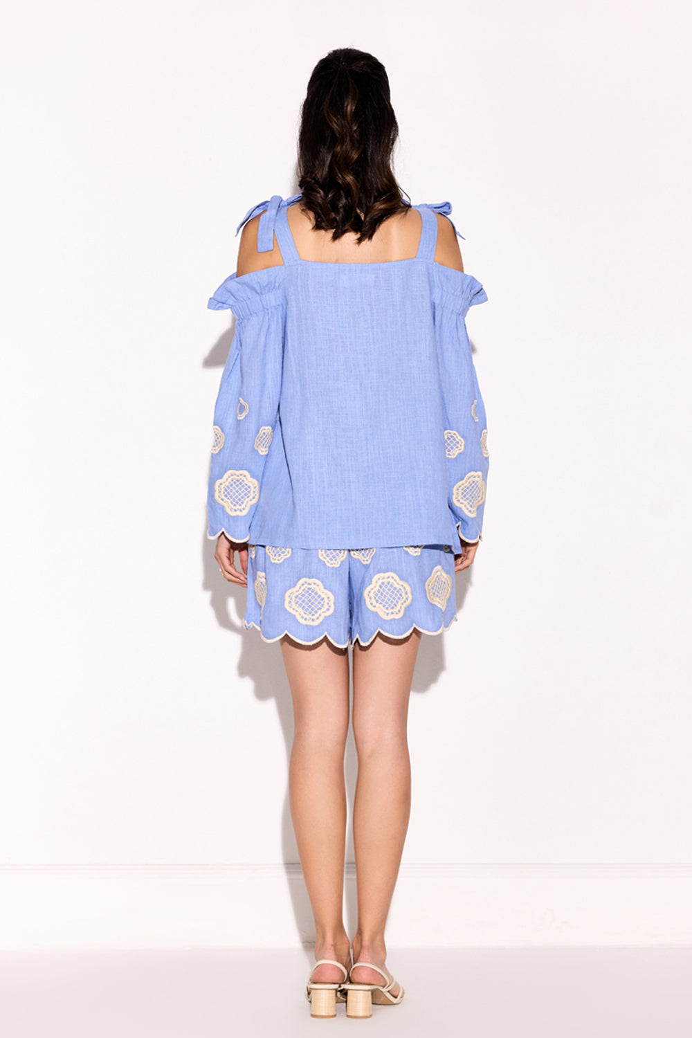 Redefined and flattering. Structured yet delicate. Beautifully crafted in fine linen with honey comb embroidered flowers on the blouse and matching set.