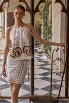 Offering a stunning embroidered silhouette and a wrap skirt.