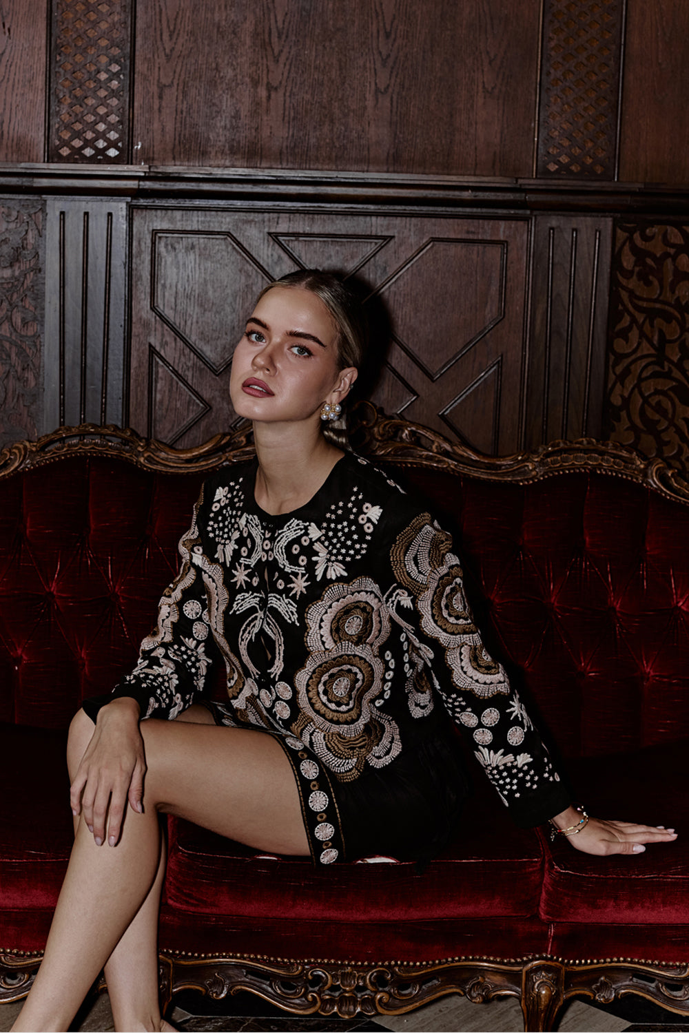 Exquisite embroidered jacket and wrap skirt with embroidered detail on the wrap. skirt adorns a swoon worthy look.