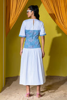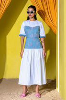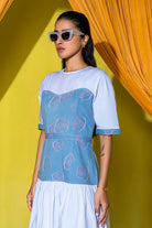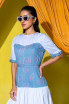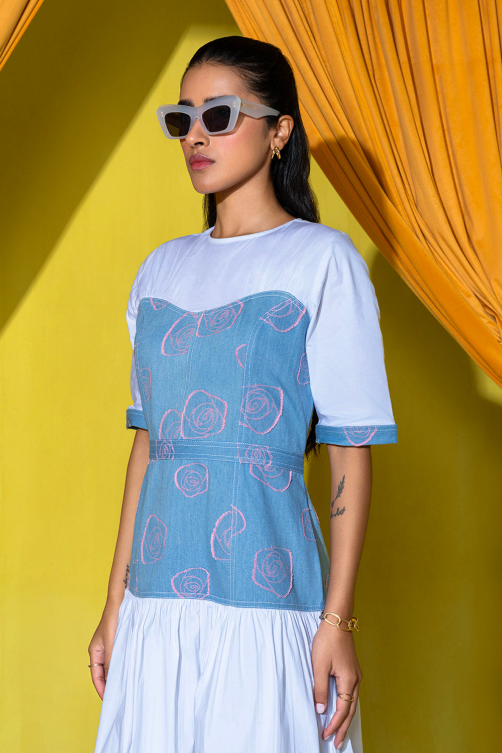 Exquisite silhouette with a denim bodice and all over applique roses. Perfect for a summer lunch or a sun downer.
