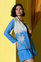 Perfect for that summer brunch or summer vacay. Honey comb Palm embroidered summer blazer with matching shorts and bustier.
