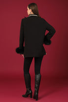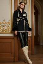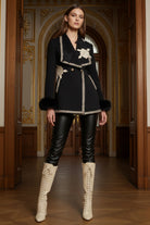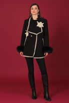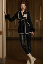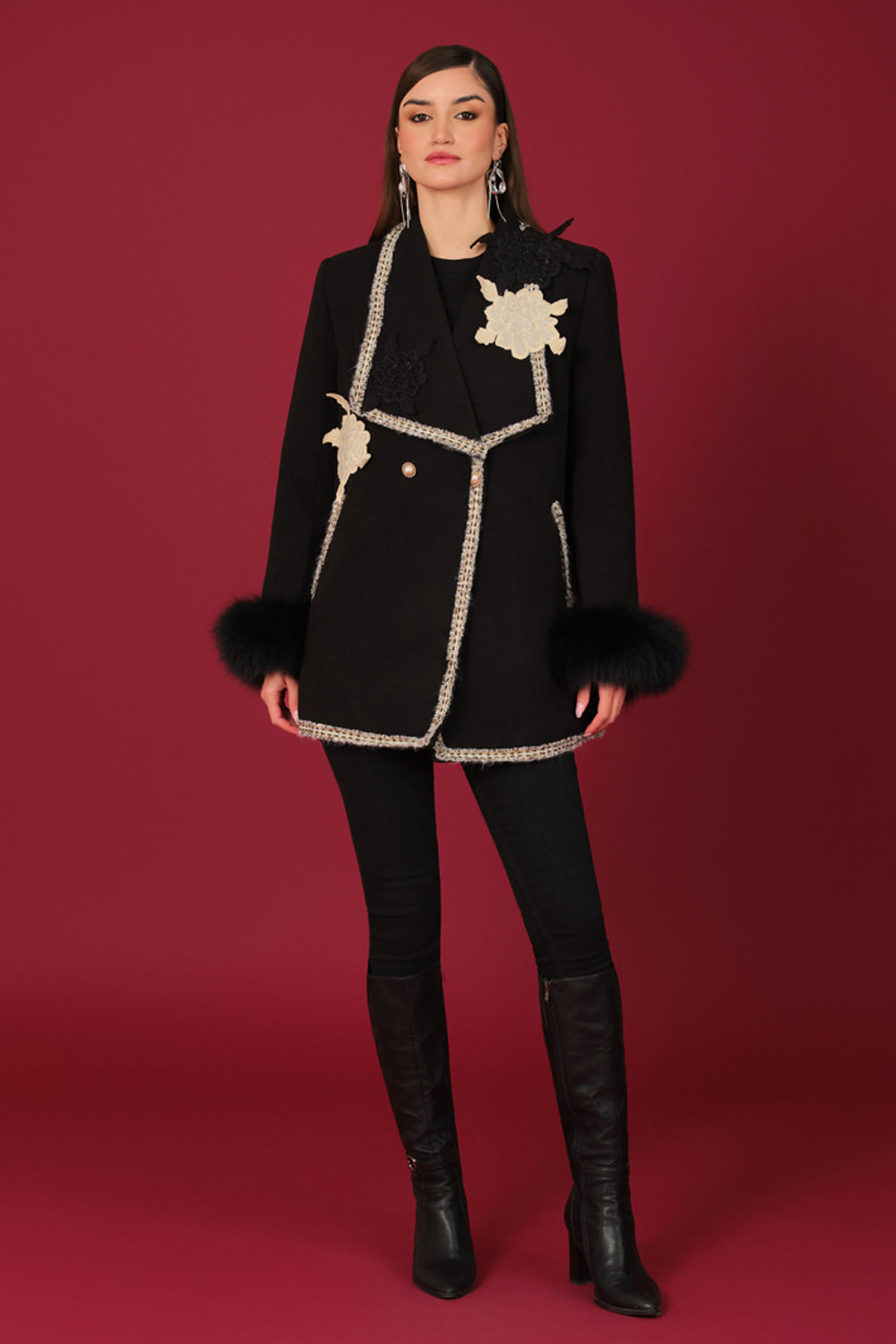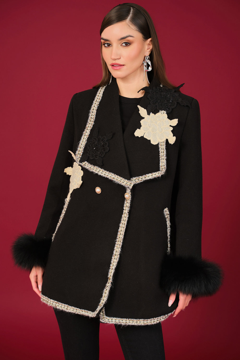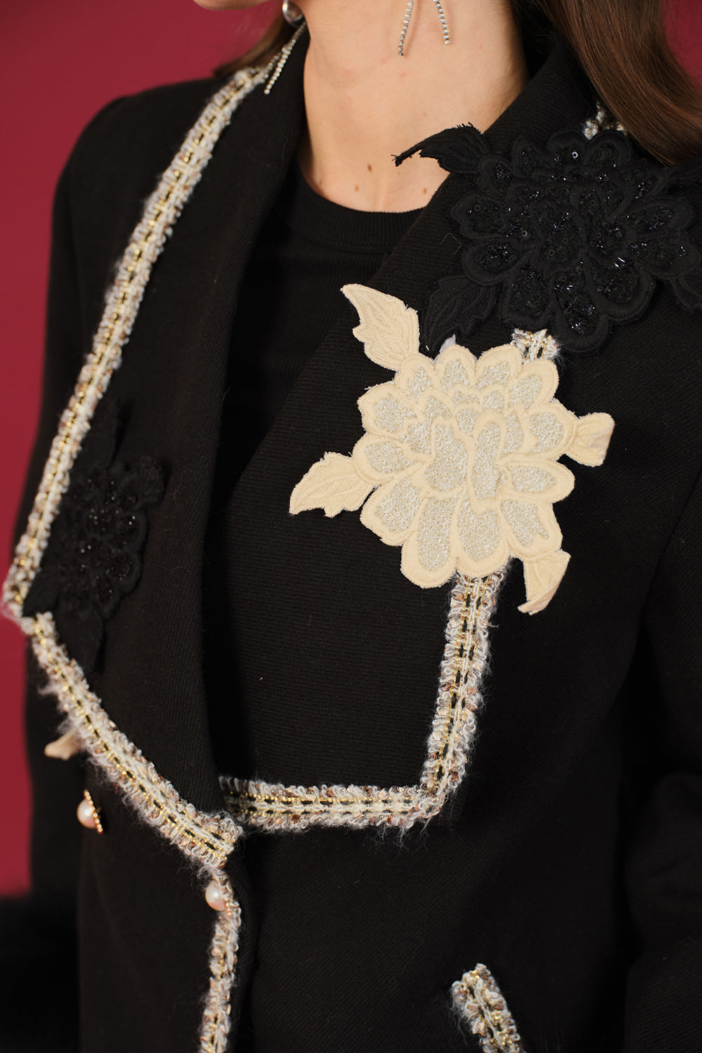 Boho-chic exclusive coat with contrast tweed trims and applique embroidered flowers.