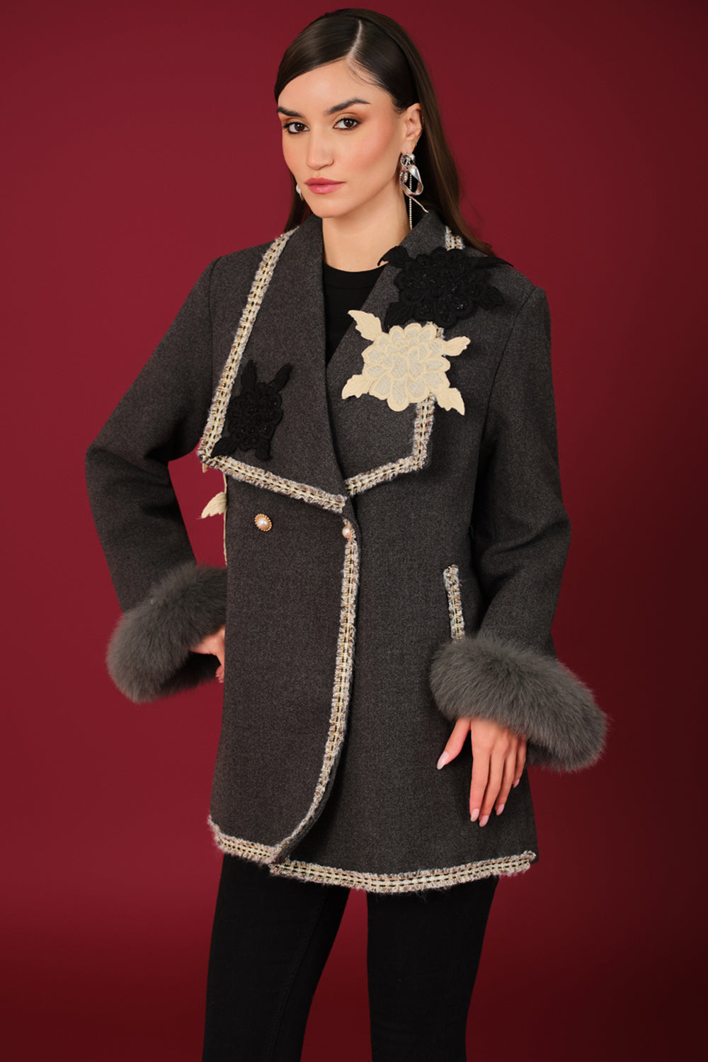 Boho-chic exclusive coat with contrast tweed trims and applique embroidered flowers.