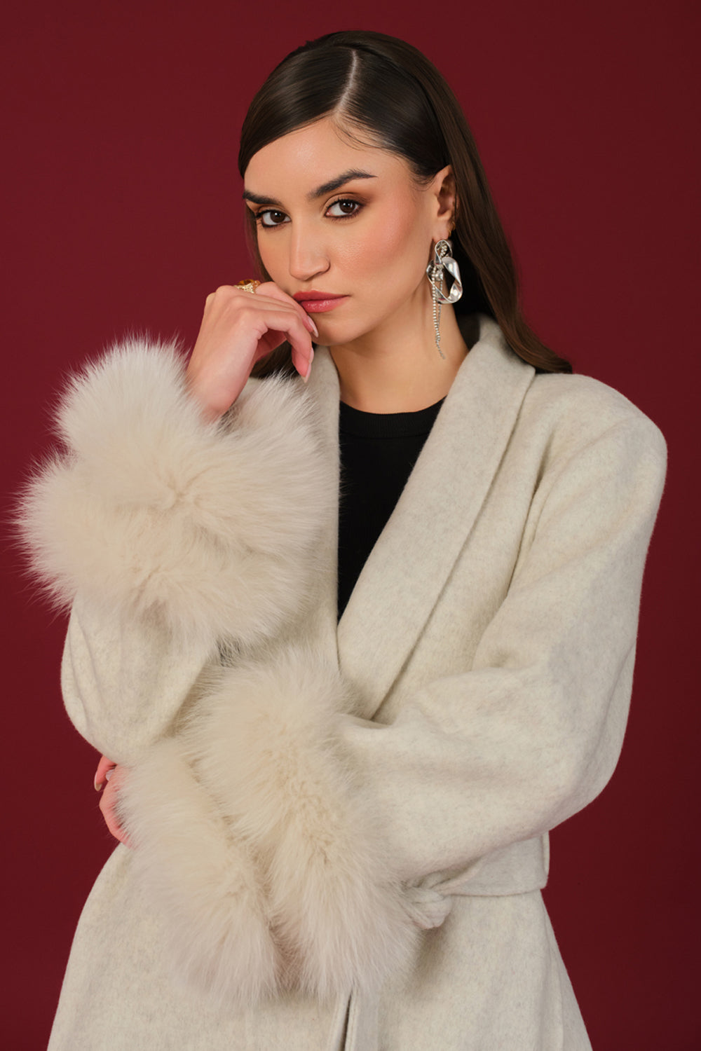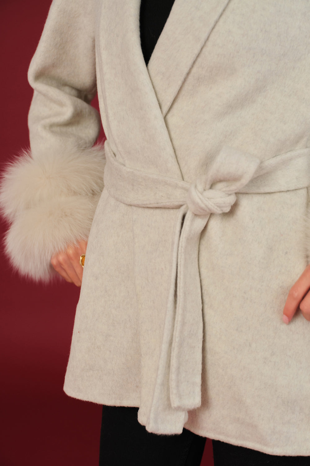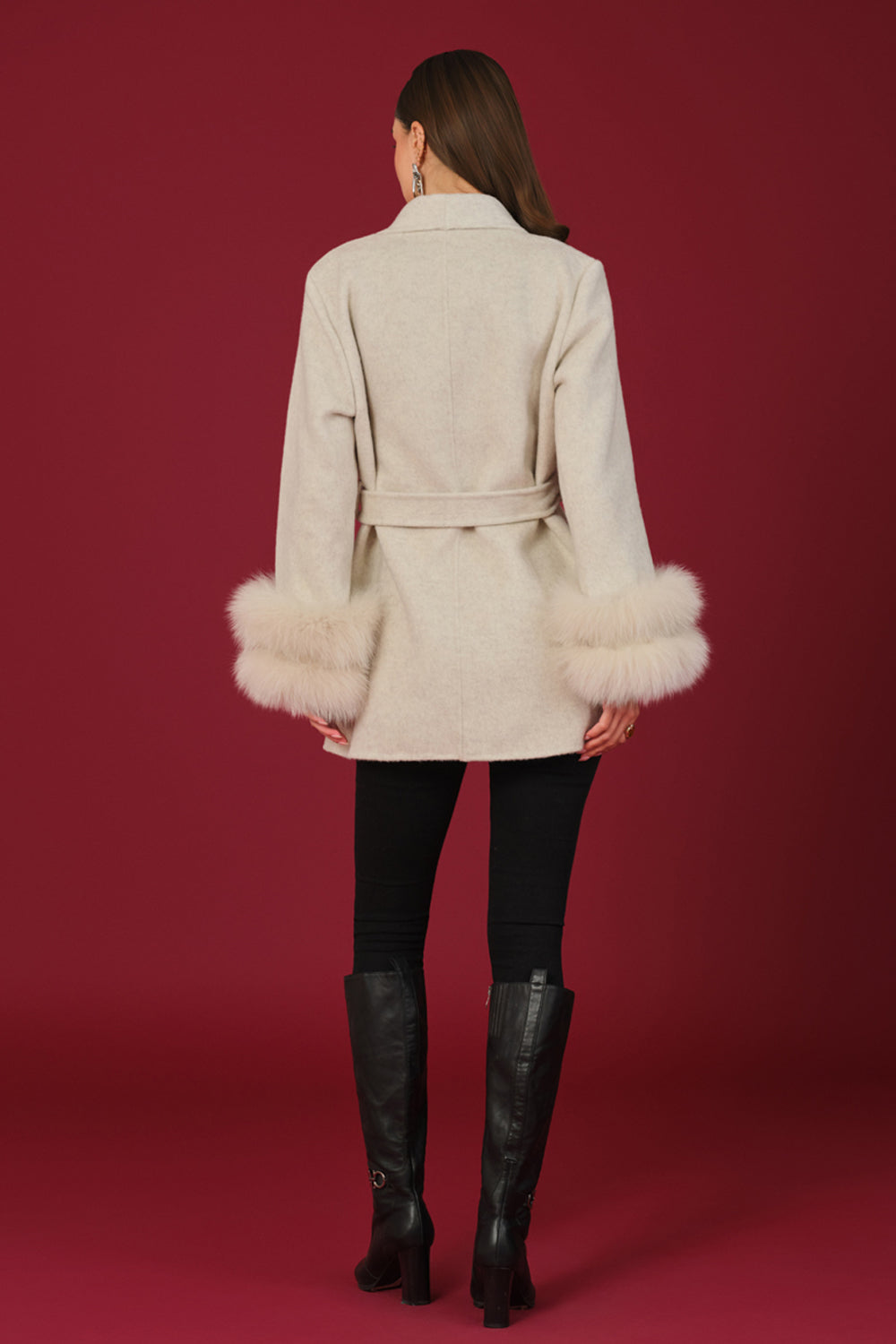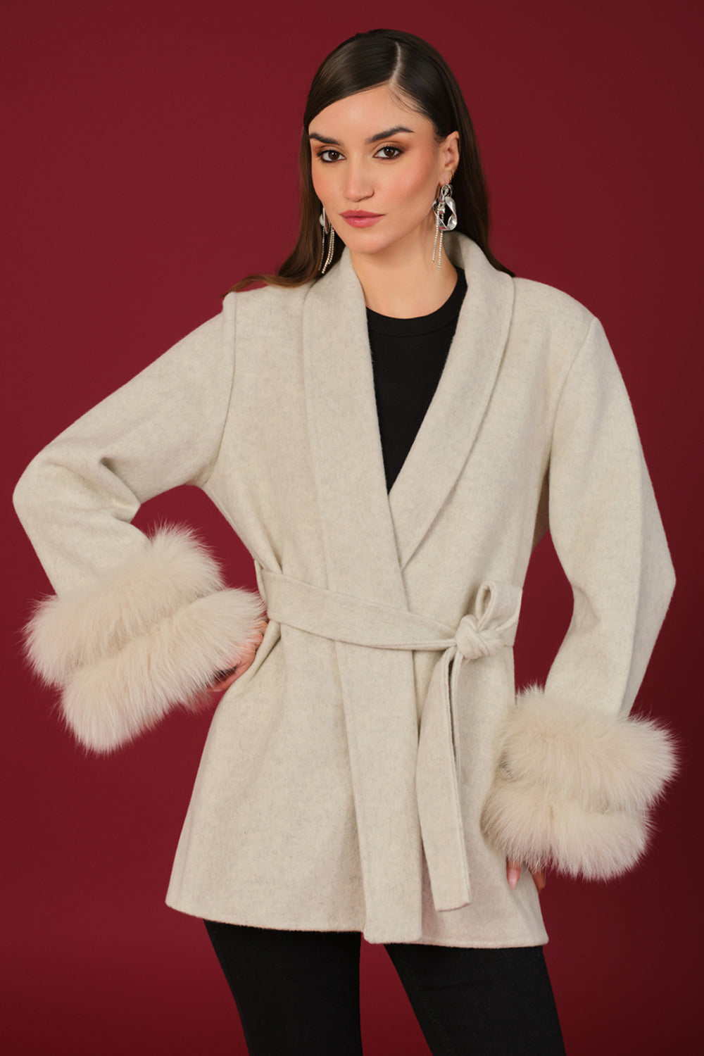 Boho-chic exclusive coat. Premium detachable fur on the sleeves, perfect for a snow holiday or peak winter 70 percent marino wool, 30 percent cashmere.