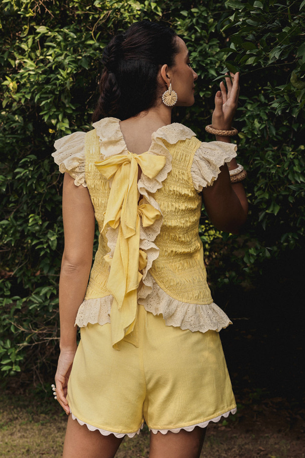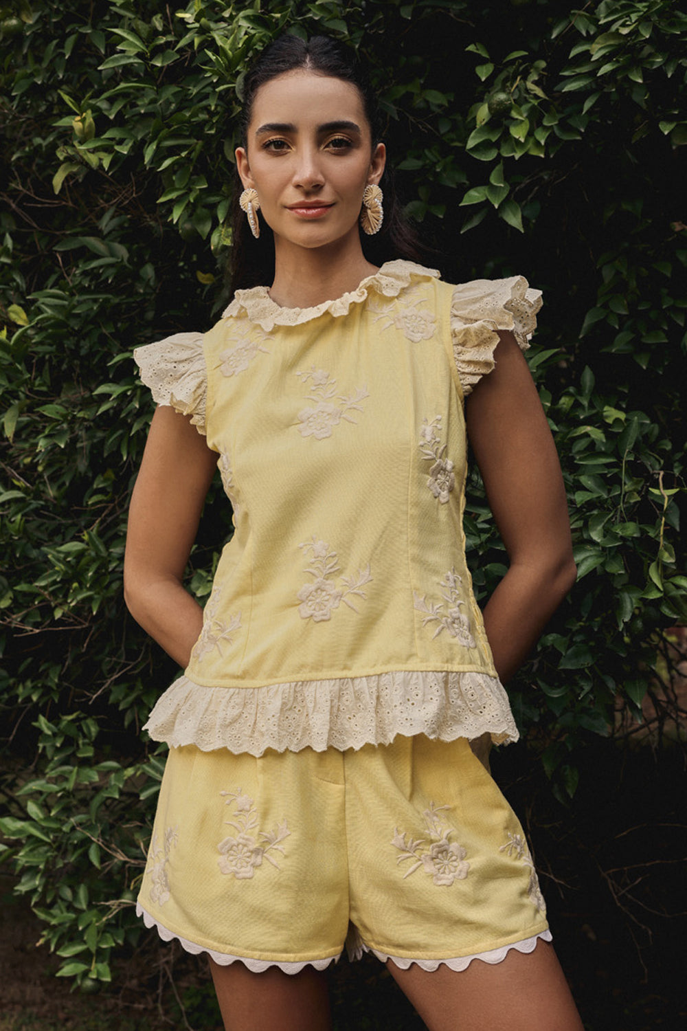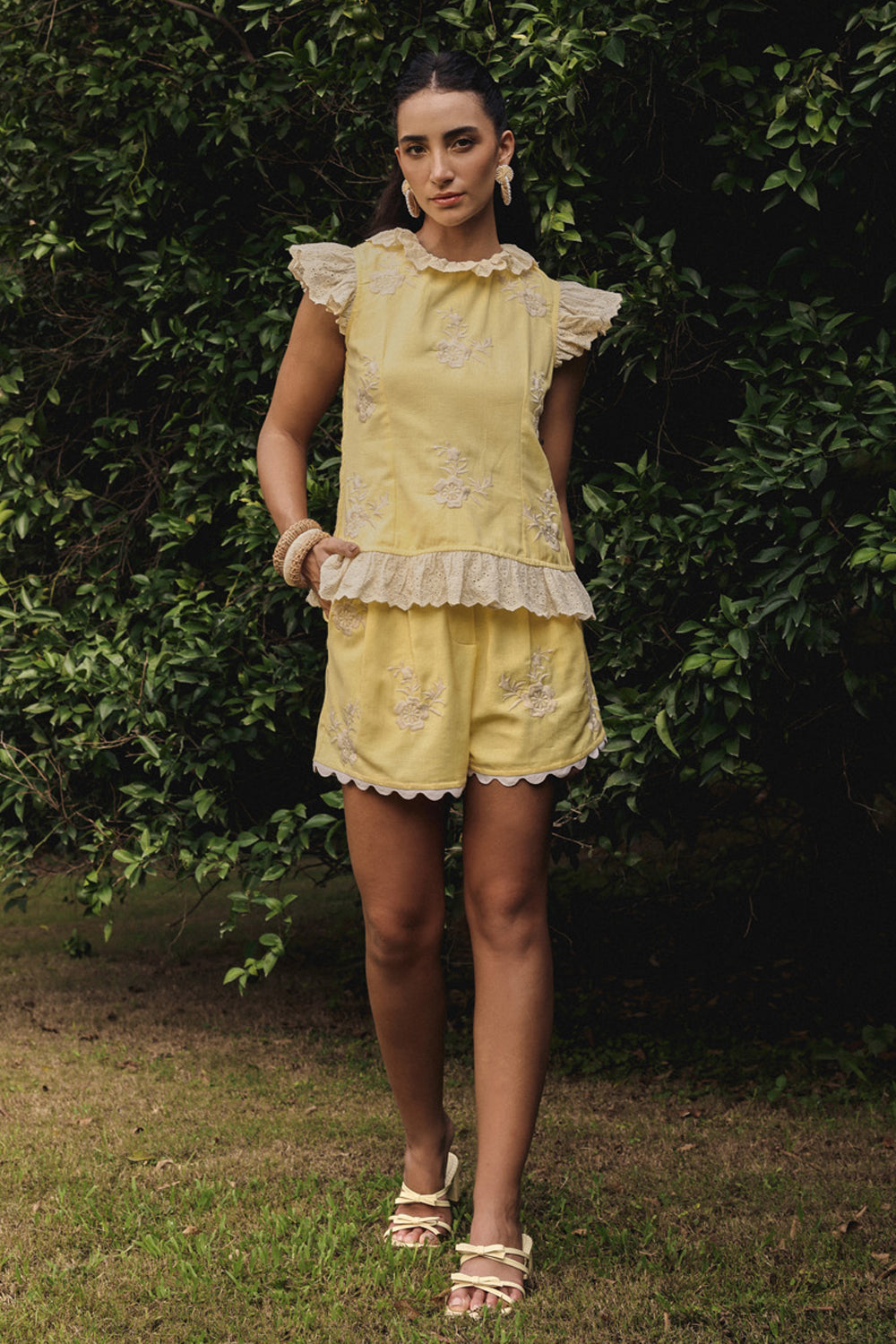 Crafted in butter cup yellow creame embroidered blouse with lace trims and hand ruched back and back ties makes this blouse exquisite. The buttercup yellow shorts with creame embroidery makes this matching set a must have