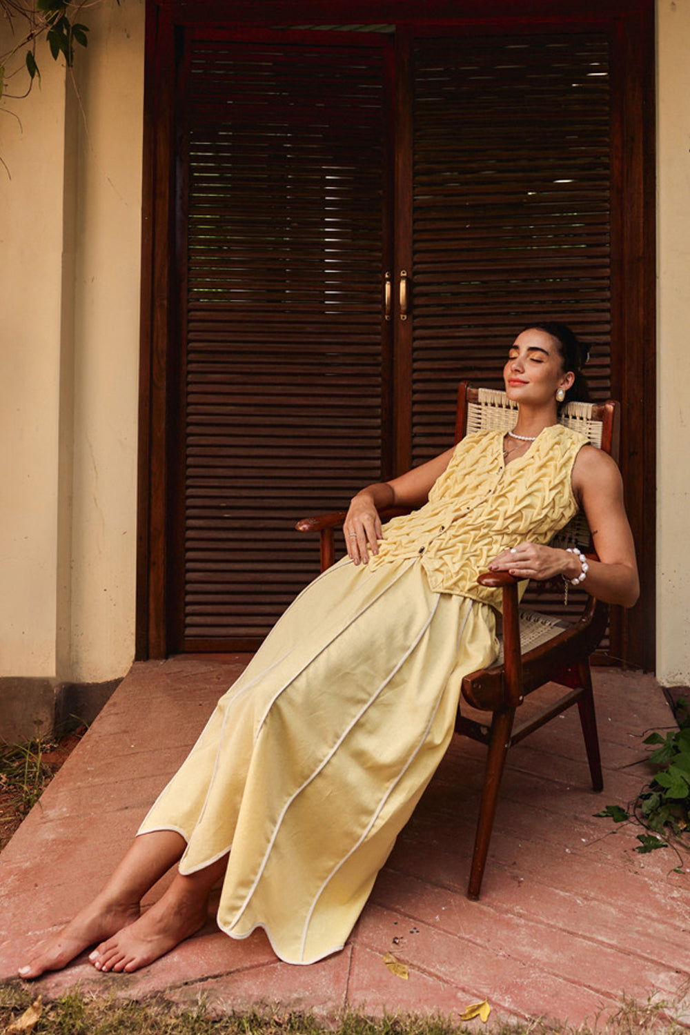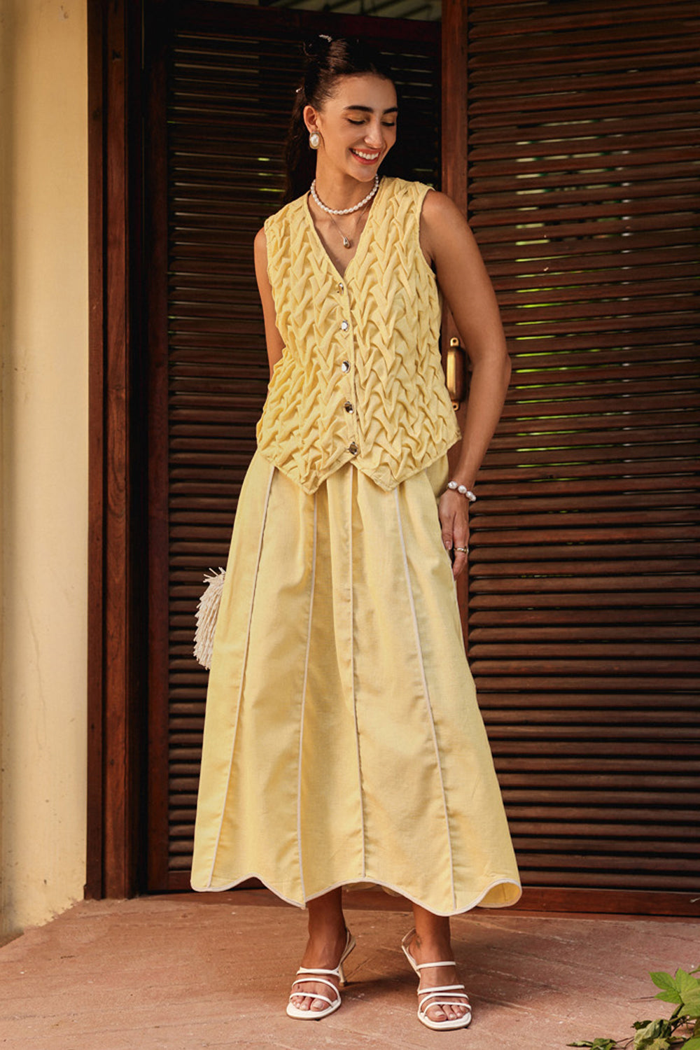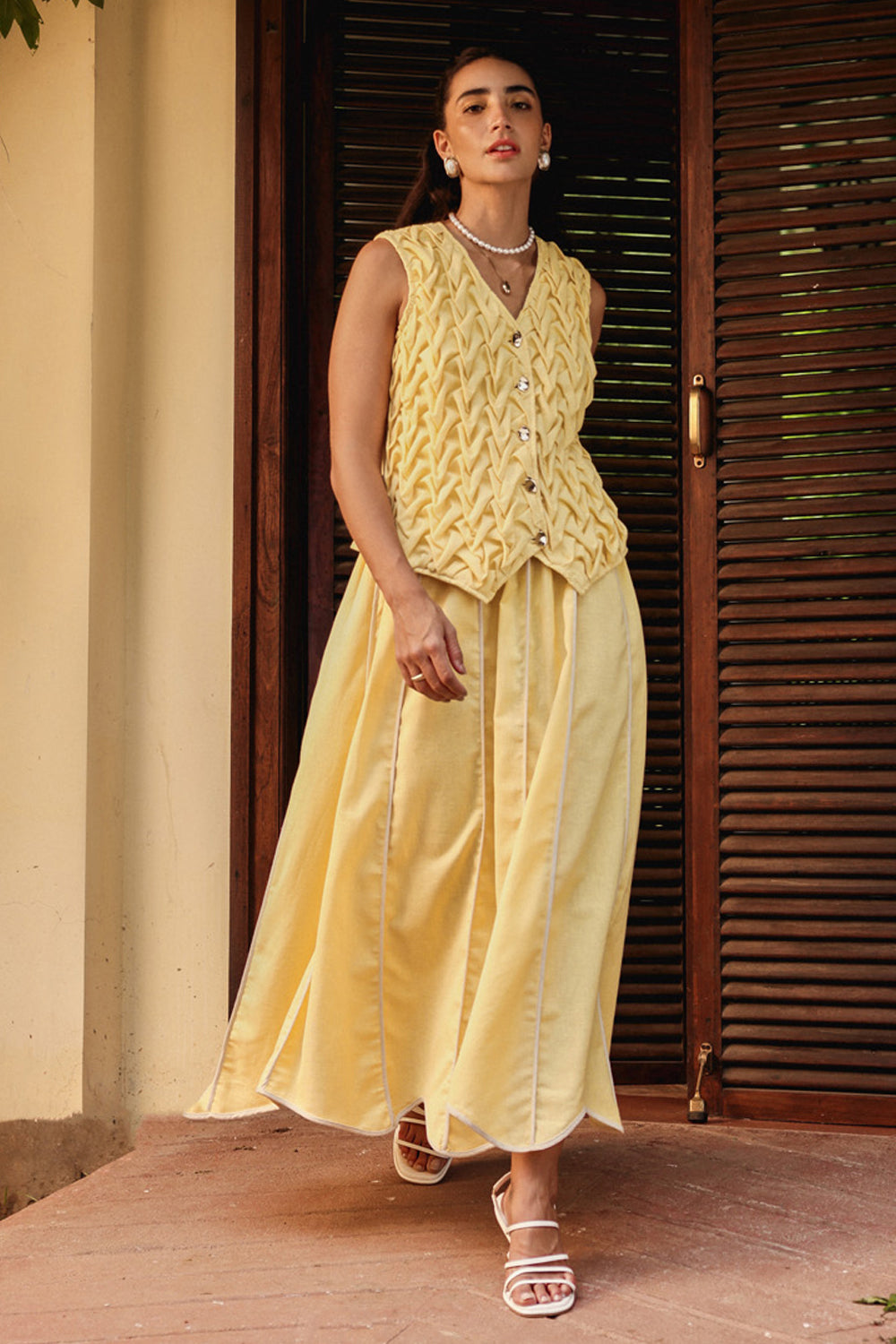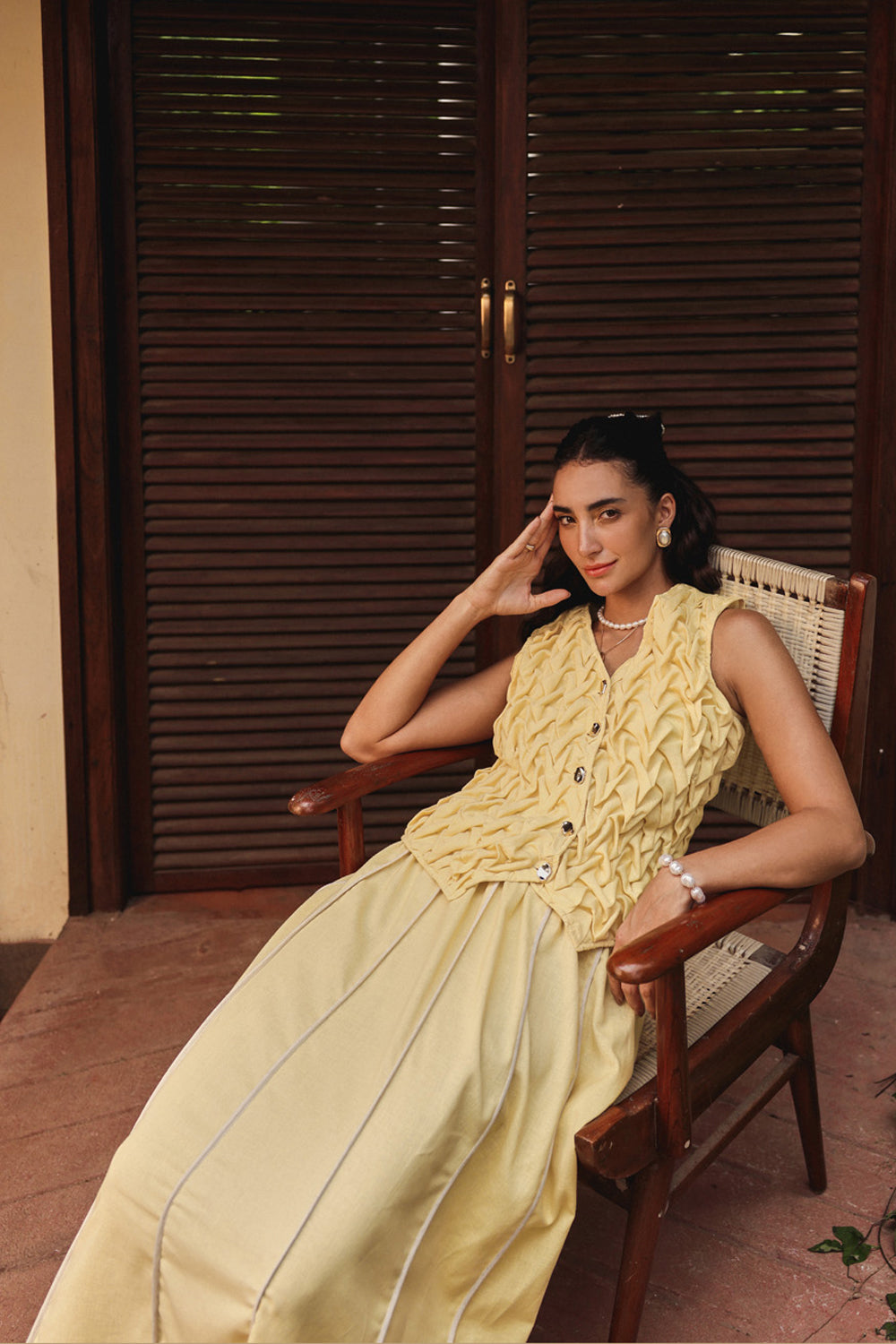 A perfect brunch or sundowner party outfit. Stunning Hand smoked waistcoat with gold buttons and contrast piping skirt.