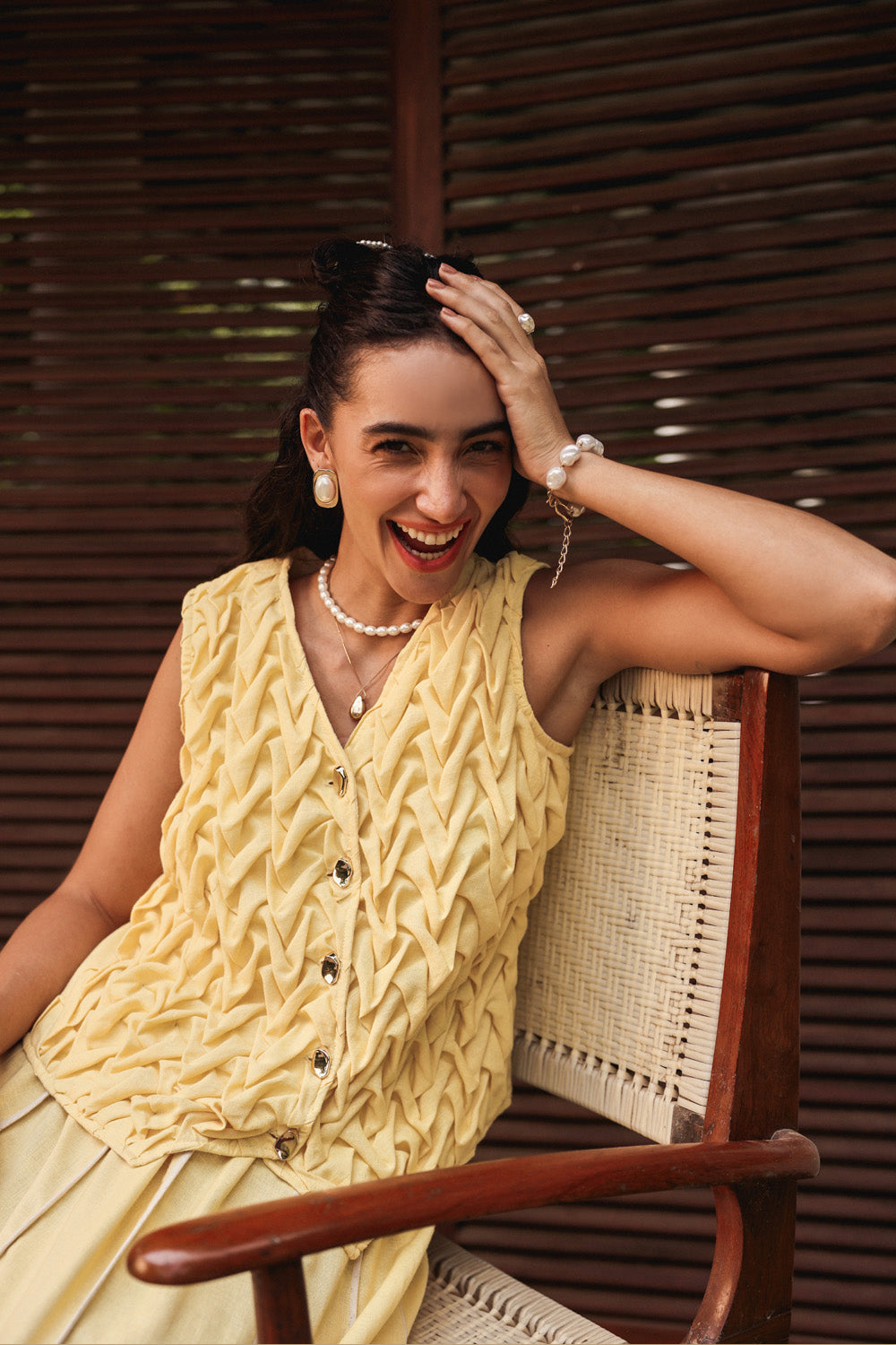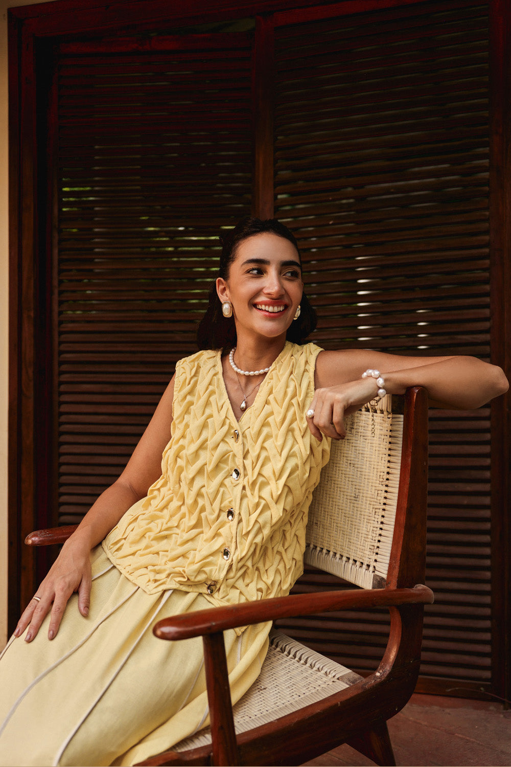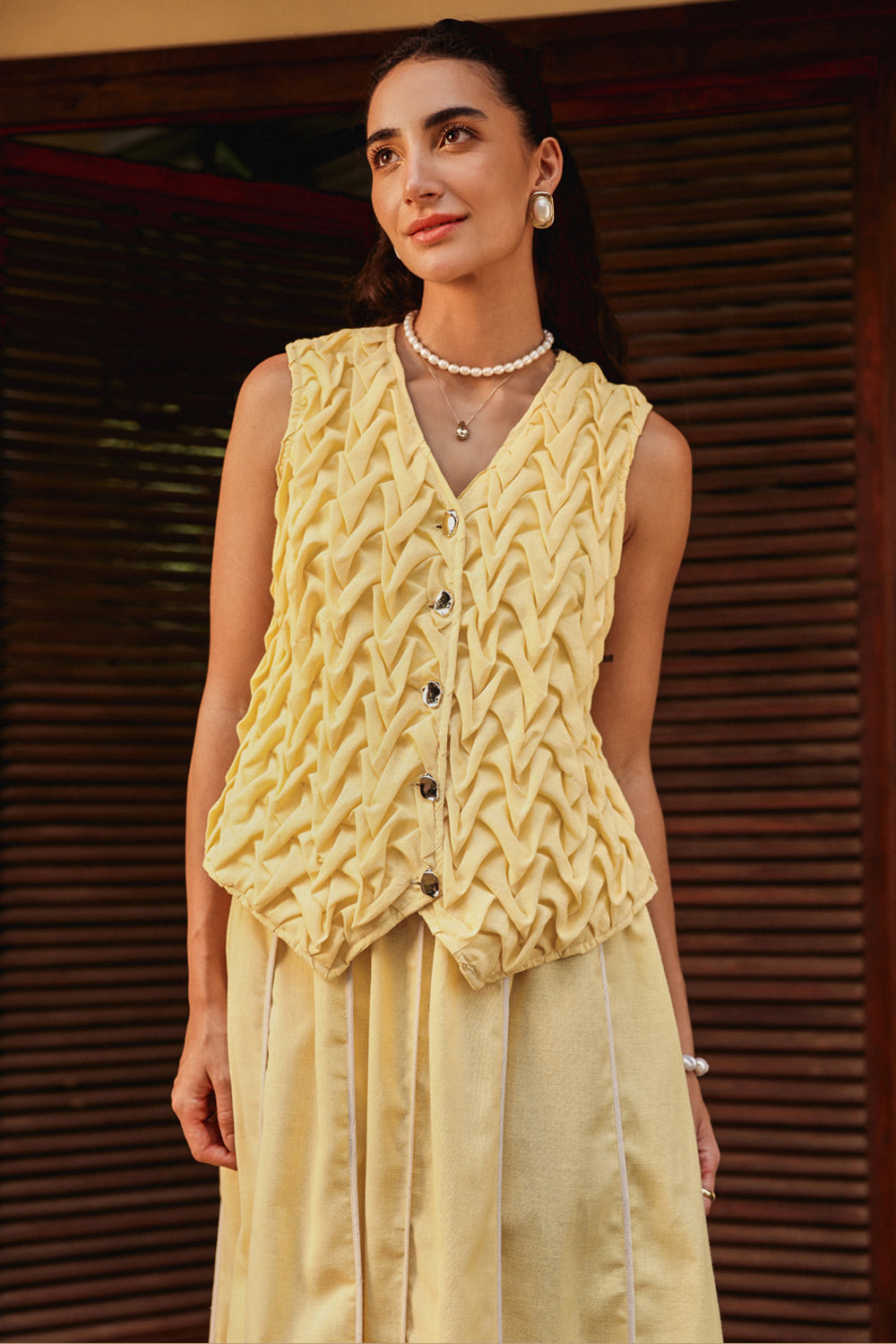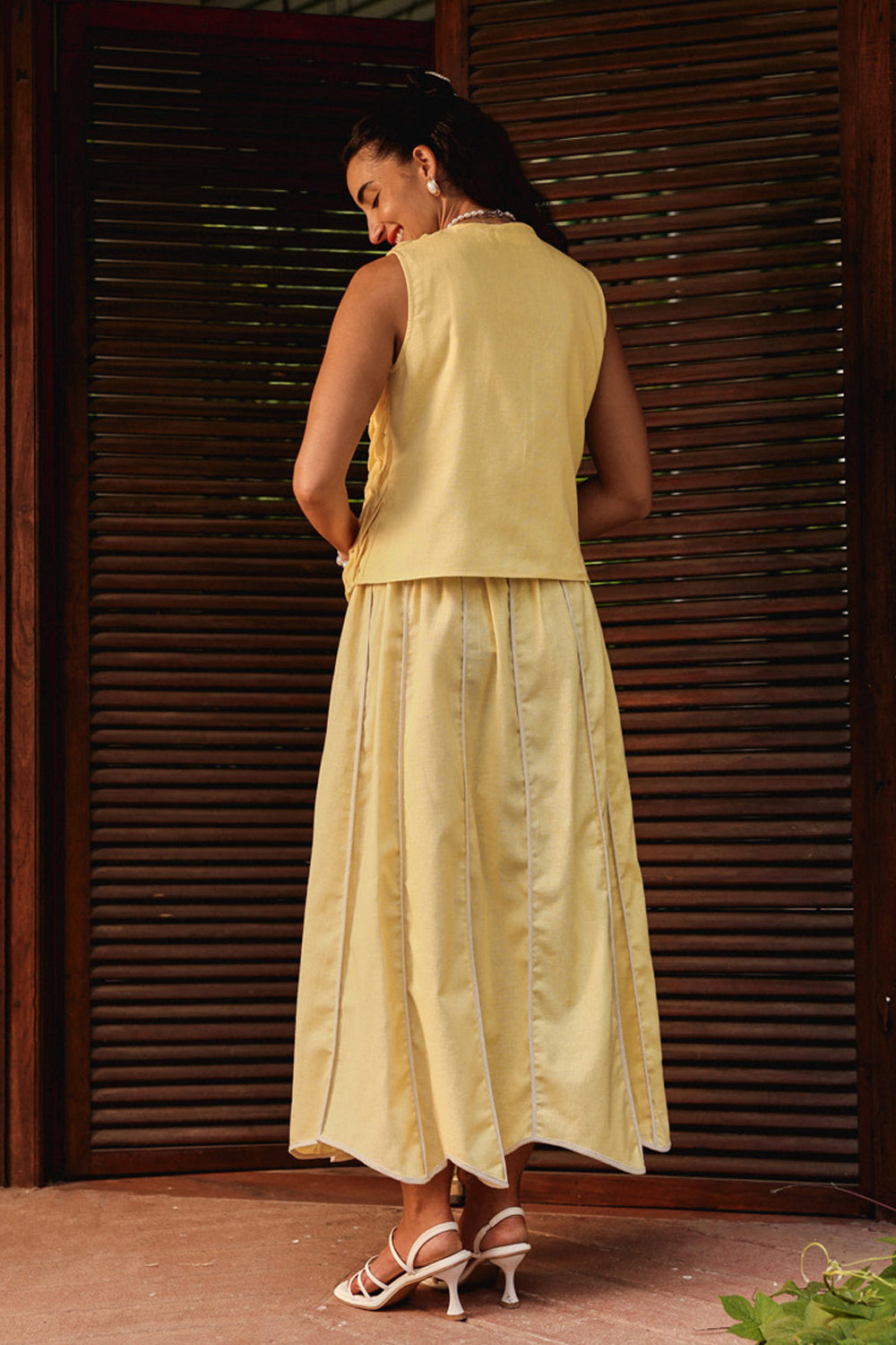 A perfect brunch or sundowner party outfit. Stunning Hand smoked waistcoat with gold buttons and contrast piping skirt.