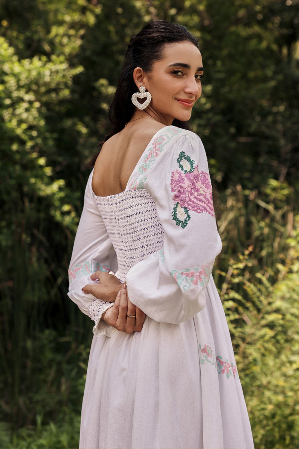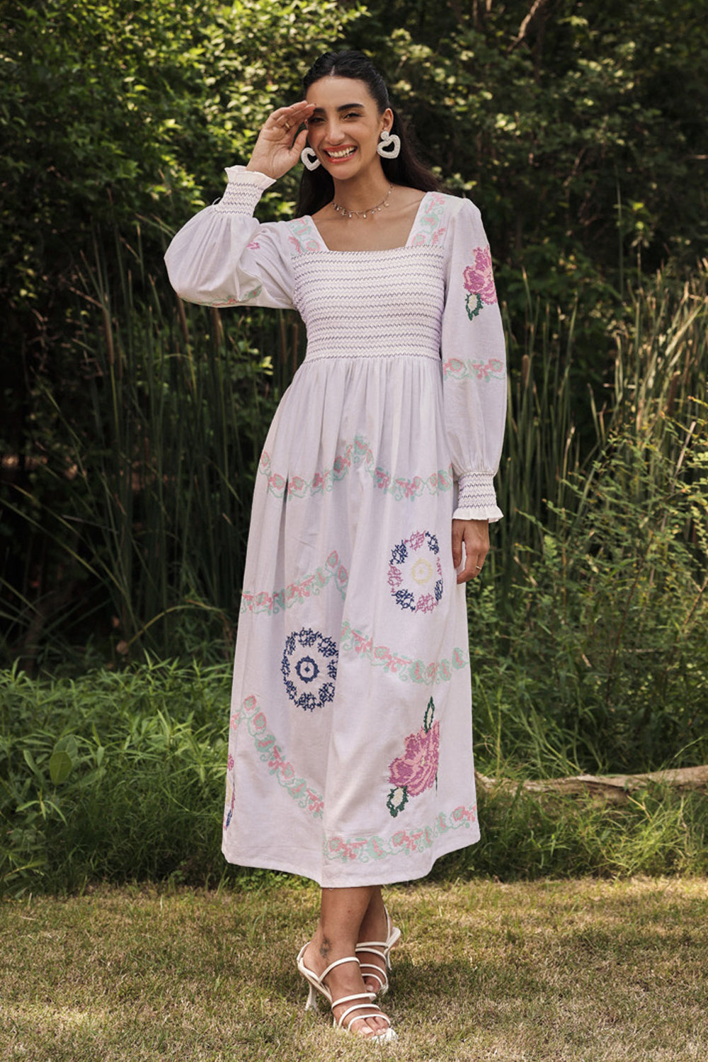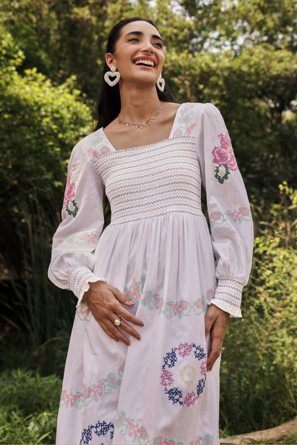 Intricate embroidered cross stitch roses embroidery dress with smoked bodice.
