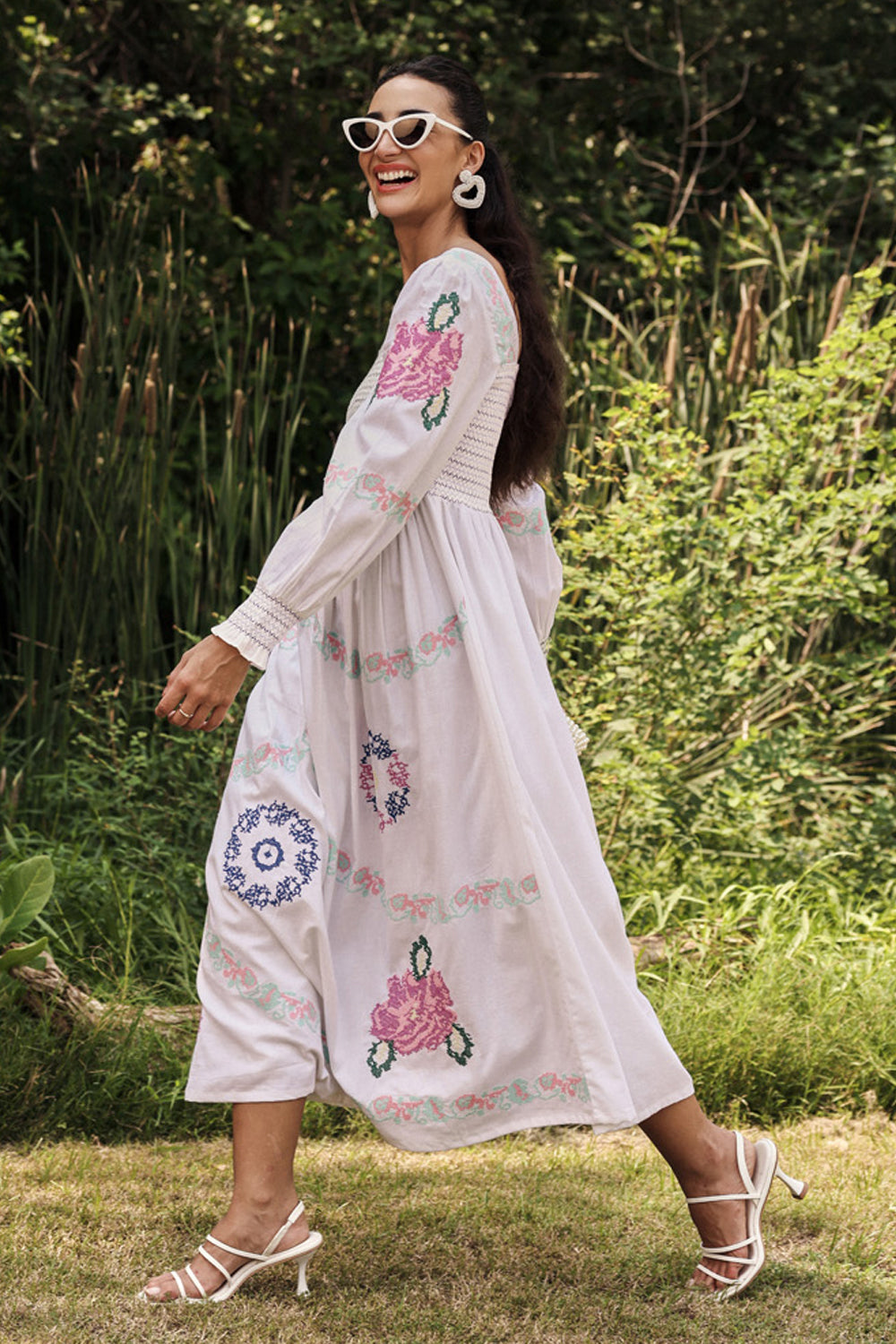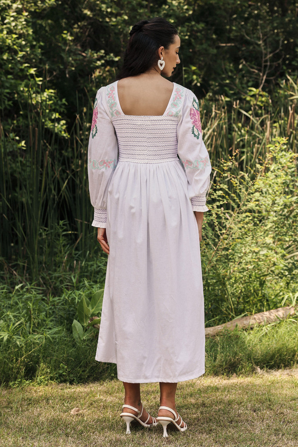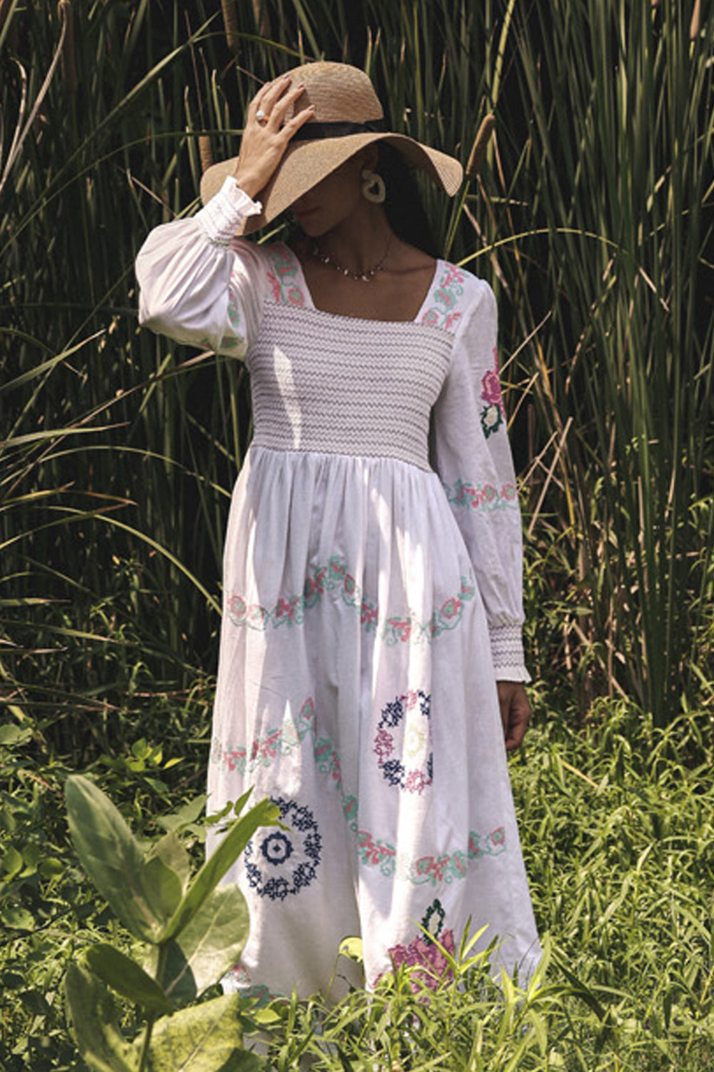Intricate embroidered cross stitch roses embroidery dress with smoked bodice.