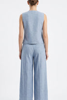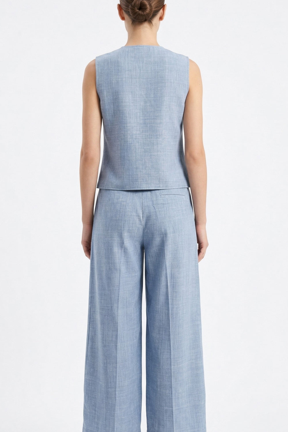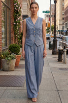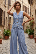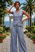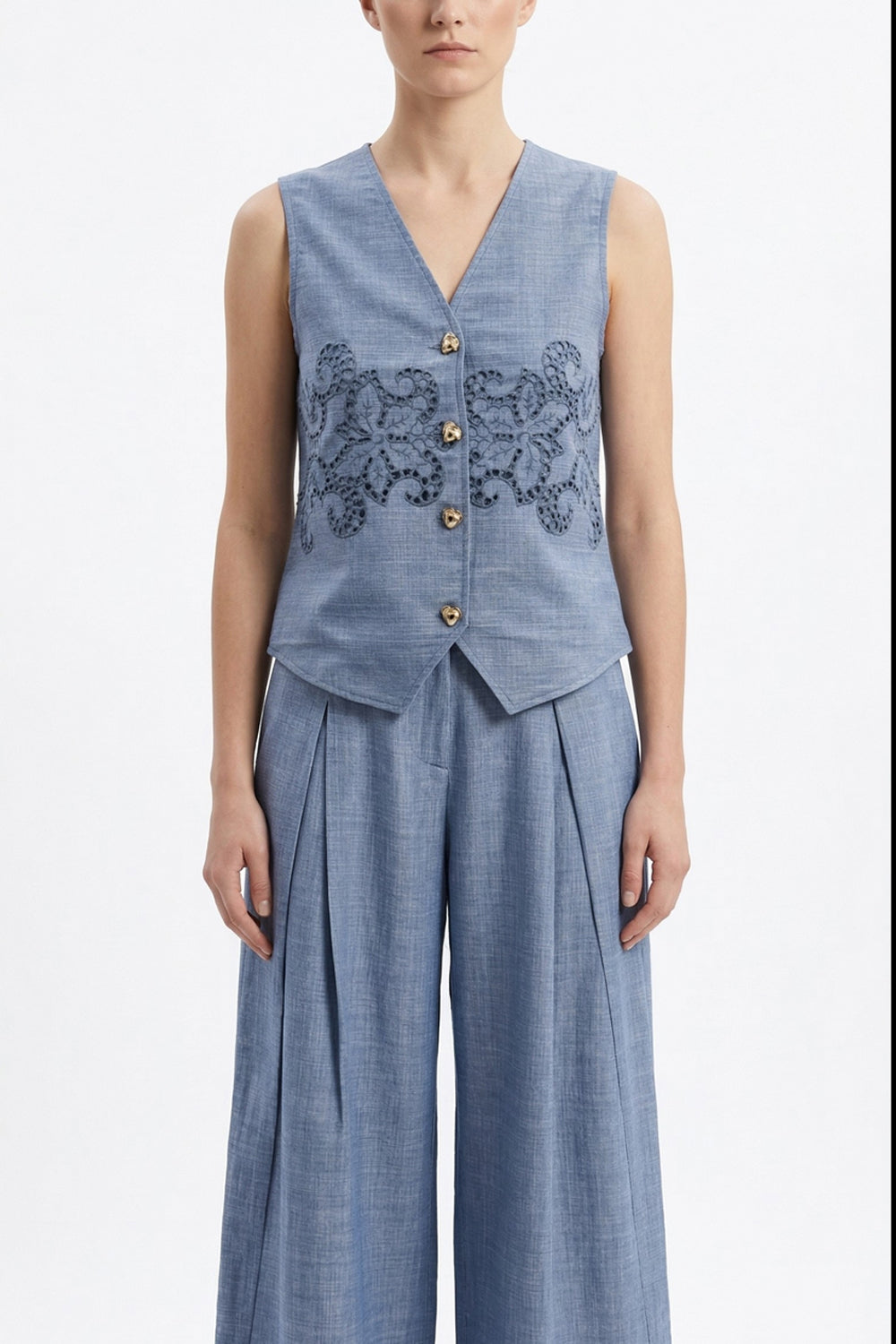 Cutwork embroidered waistcoat with gold metal buttons and barrel pleated flowy pants makes this outfit ultra edgy and chic. A Summer staple.