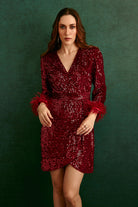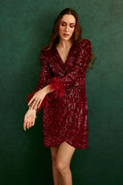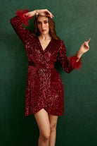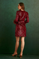 This beautifully crafted sequinned dress featuring feathers and a striking silhouette makes the dress a heads turn statement.