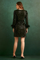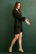 This beautifully crafted sequinned dress featuring feather and a striking silhouette makes the dress a heads turn statement.