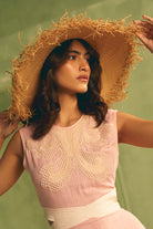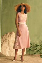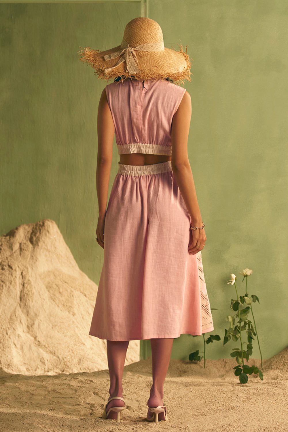 Cutwork embroidered neckline and bottom hem with creame belt and waist cut outs.This pastel pink midi dress is an absolute must have in your new summer wardrobe.