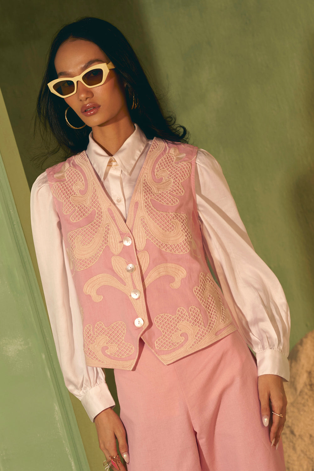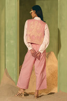 A Boho-Chic Exclusive,Cutwork embroidered waist coat front and back makes this set unique.