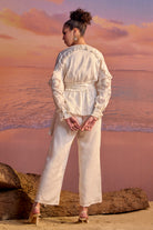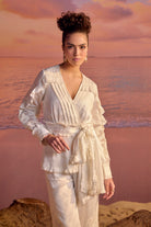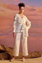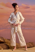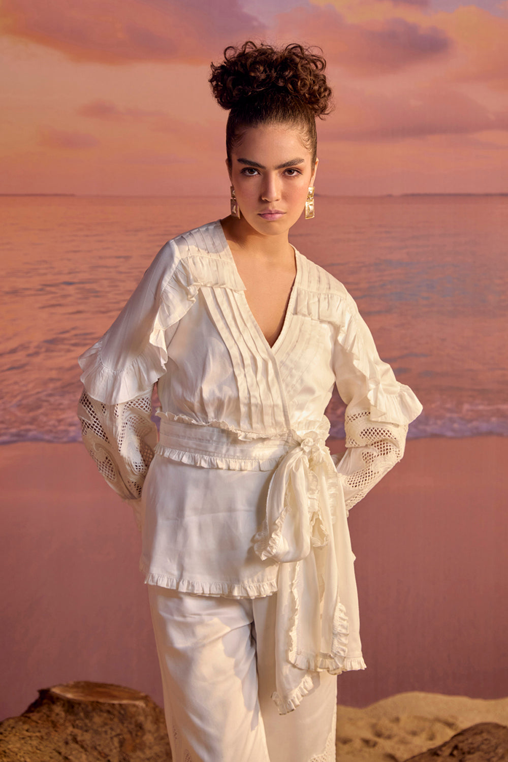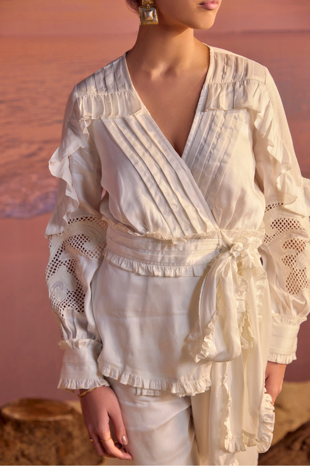 Cutwork embroidered sleeved wrap blouse with ruffle detailing. Cutwork embroidered at the bottom hem.