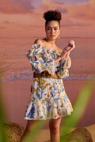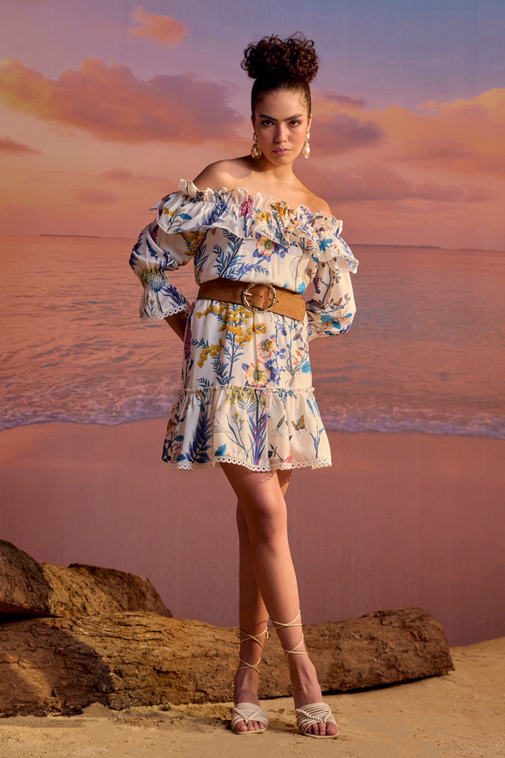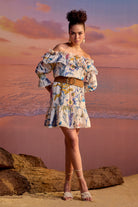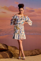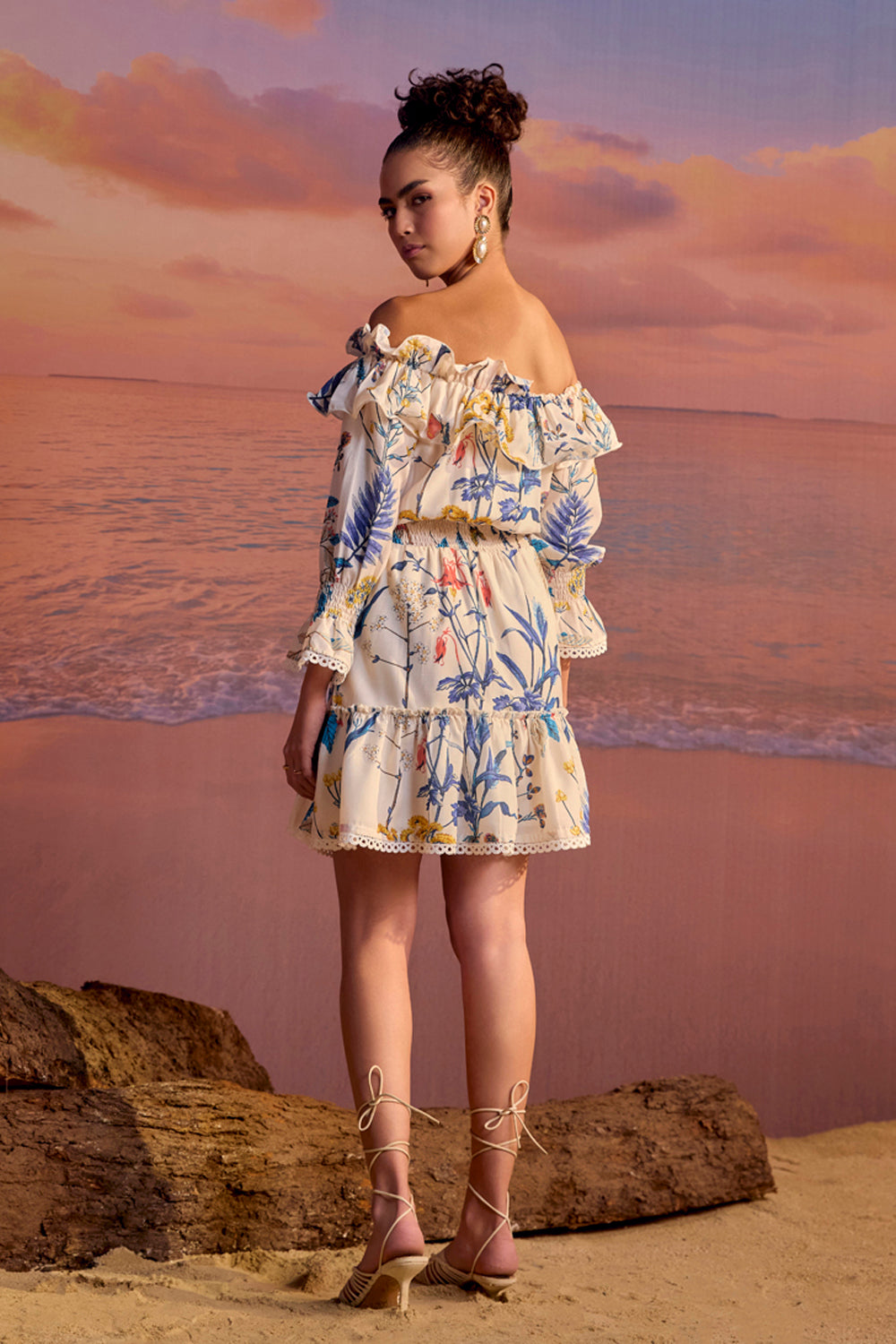 Ruffled off the shoulder dainty printed dress with smoked waistline.
