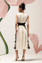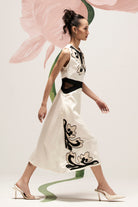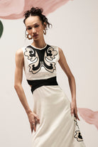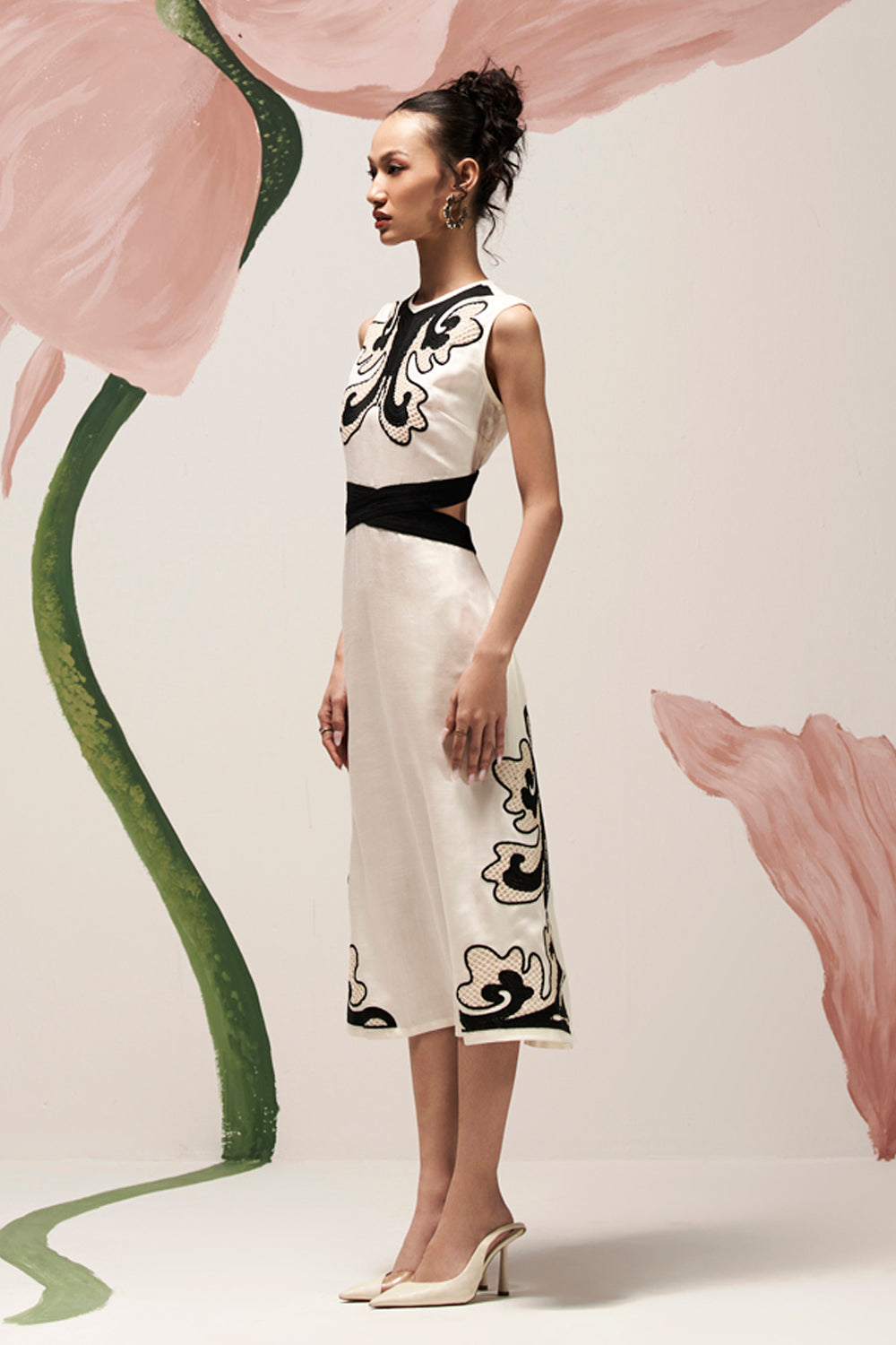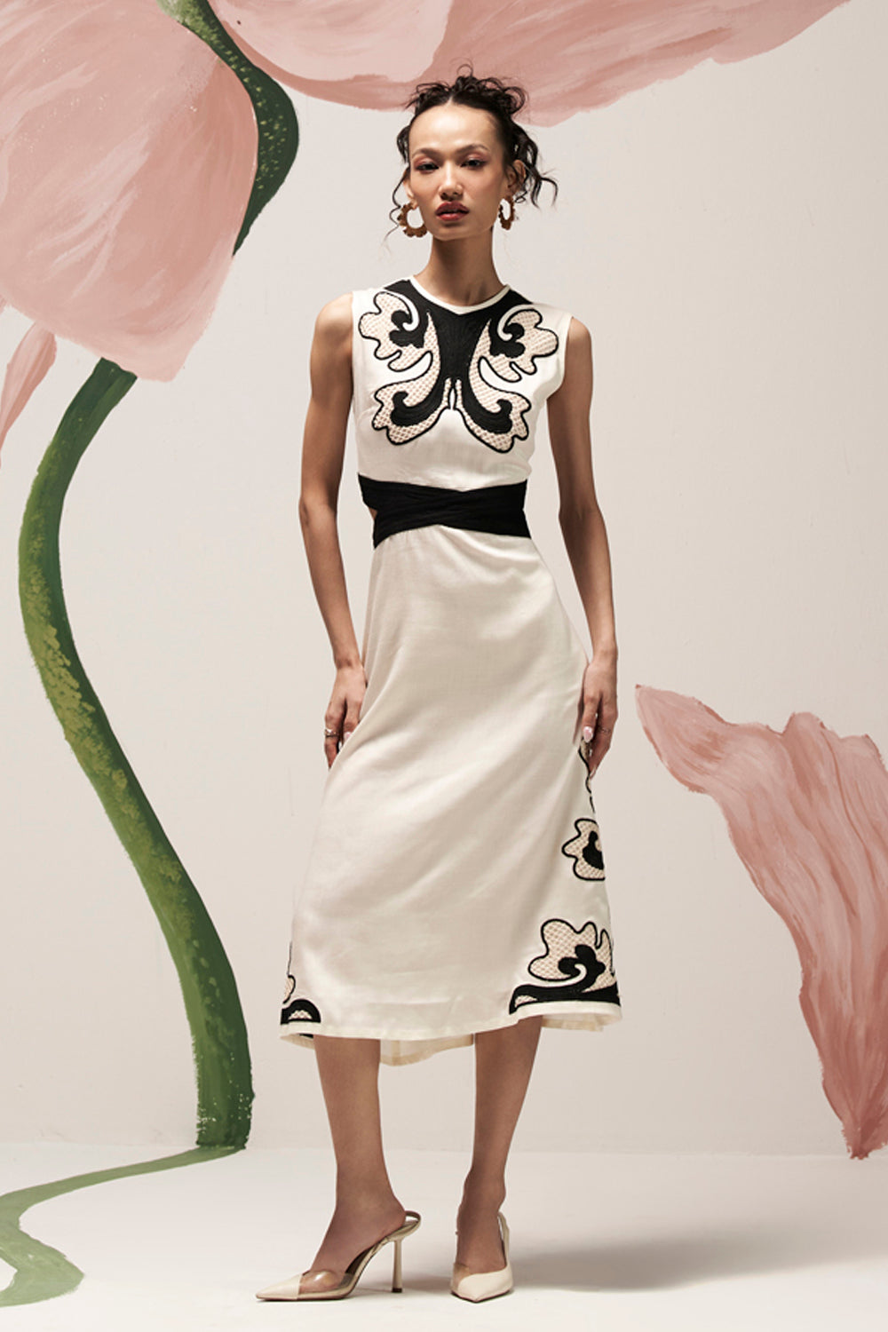 Cutwork embroidered neckline and bottom hem with stitch detailed belt and waist cut outs.This monochrome midi dress is an absolute must have in your new summer wardrobe.