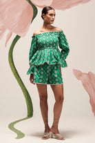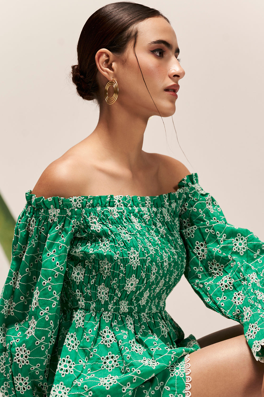off the shoulder broderie matching set, smoked yoke and detailed with a delicate lace.