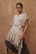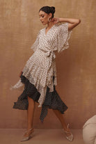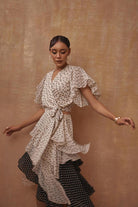 Beautifully crafted wrap blouse with asymmetrical layered skirt. Perfect for a brunch or a sundown.