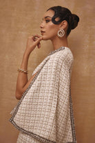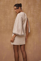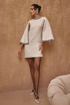 Finely crafted metallic tweed dress with contrast tweed trims and hand embellished pearl buttons.