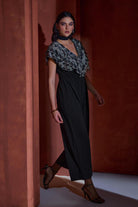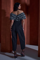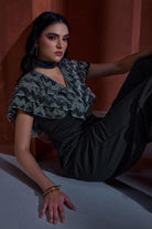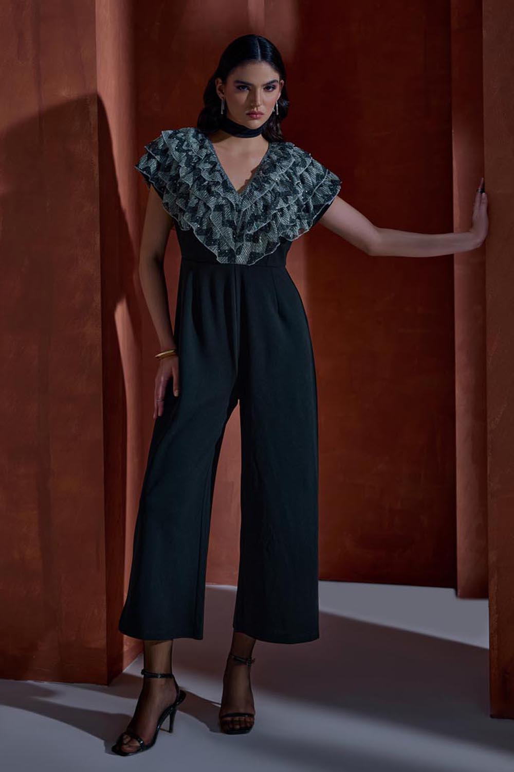 Ruffled neckline jumpsuit. Versatile and Shimmery.