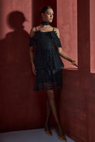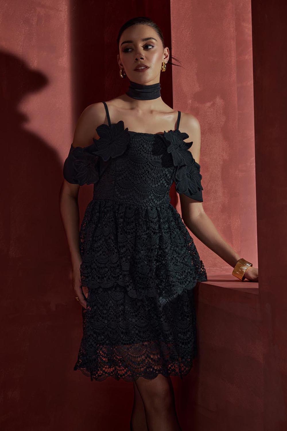 Off the shoulder mini dress with layers of lace and 3d flower cut outs. Perfect for an event of a celebration.