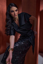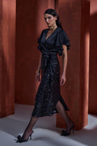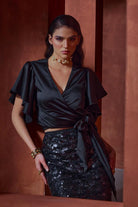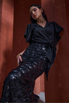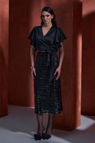 Wrap blouse with flutter sleeves and sequinned skirt. Classic and elegant.