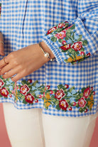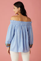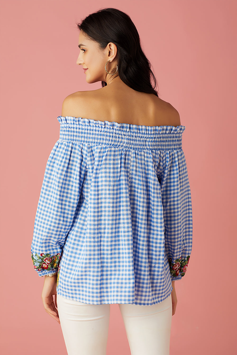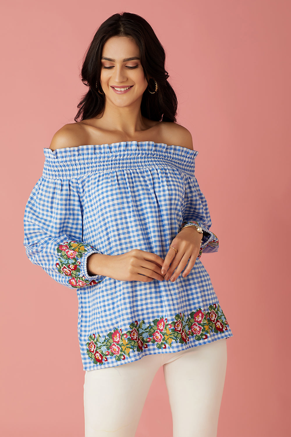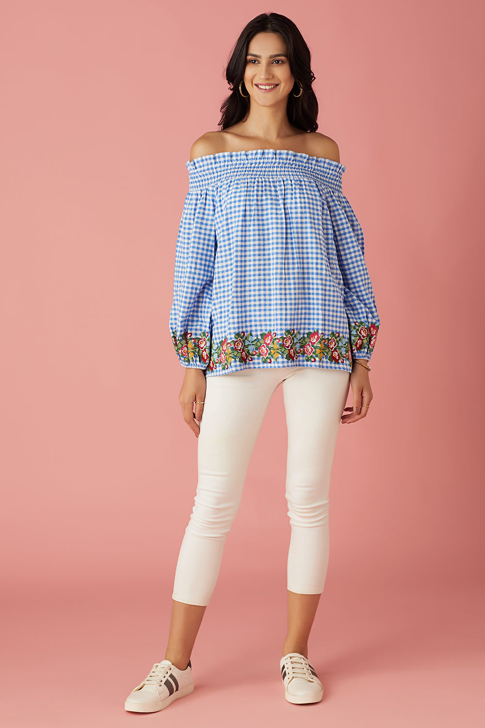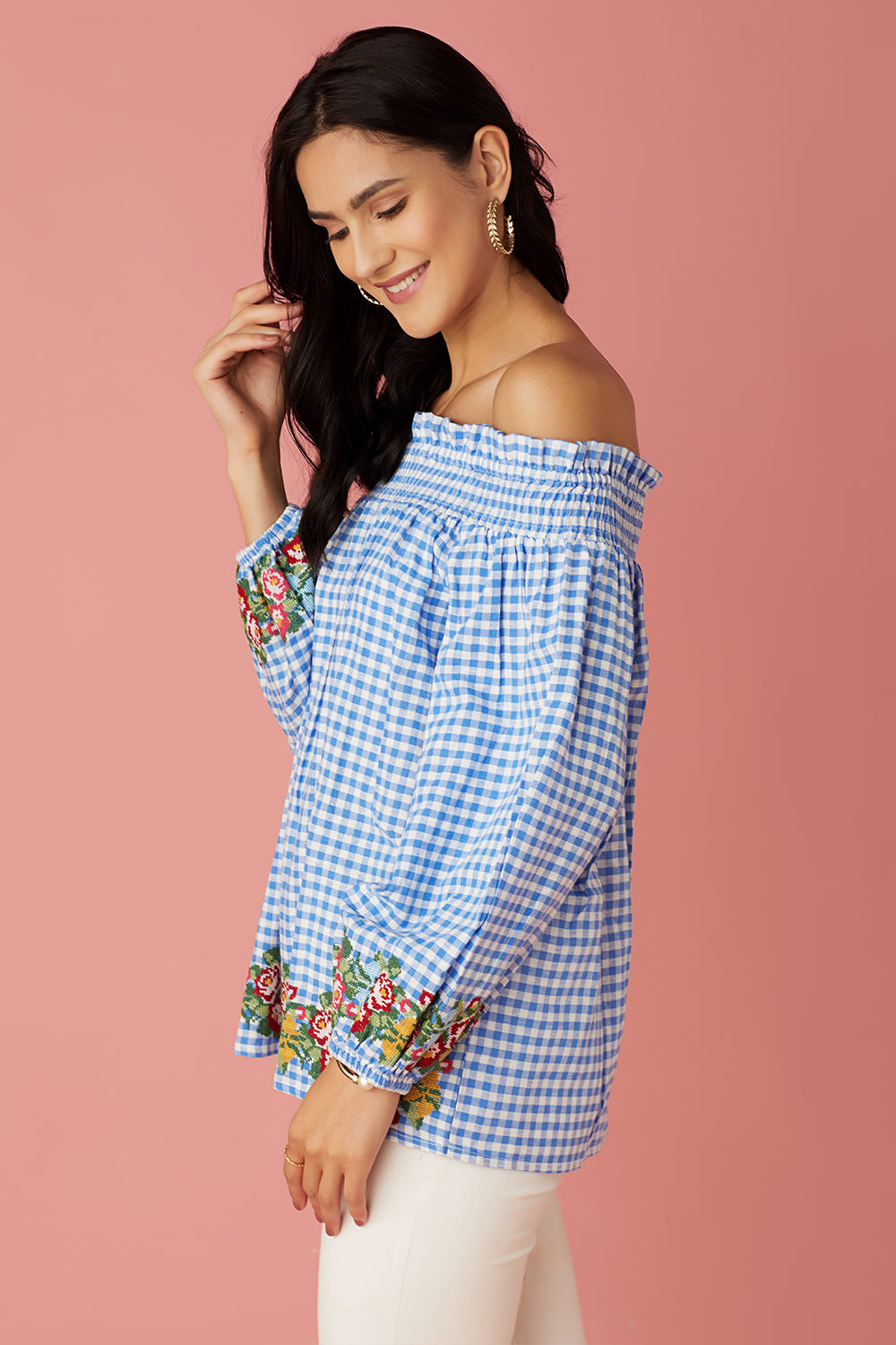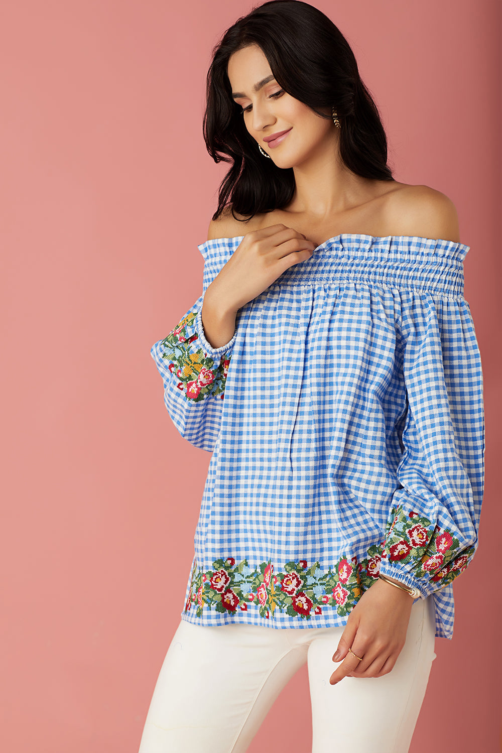 Enchanting floral embroidery and a flowy fit ensures the off shoulder blouse will be a warm weather favourite.