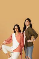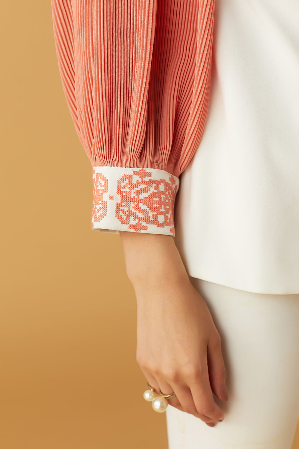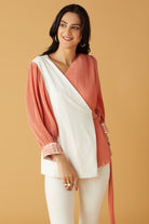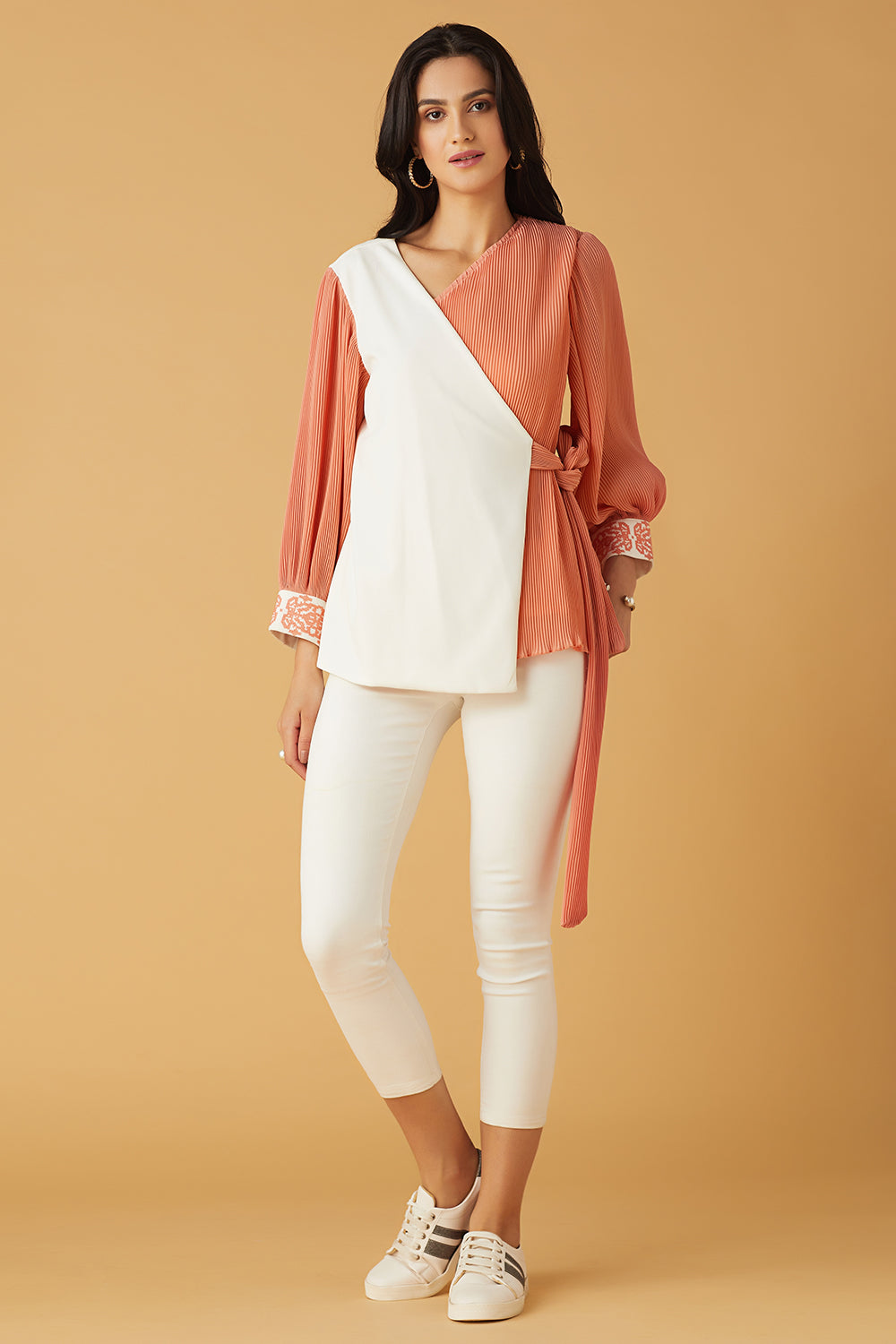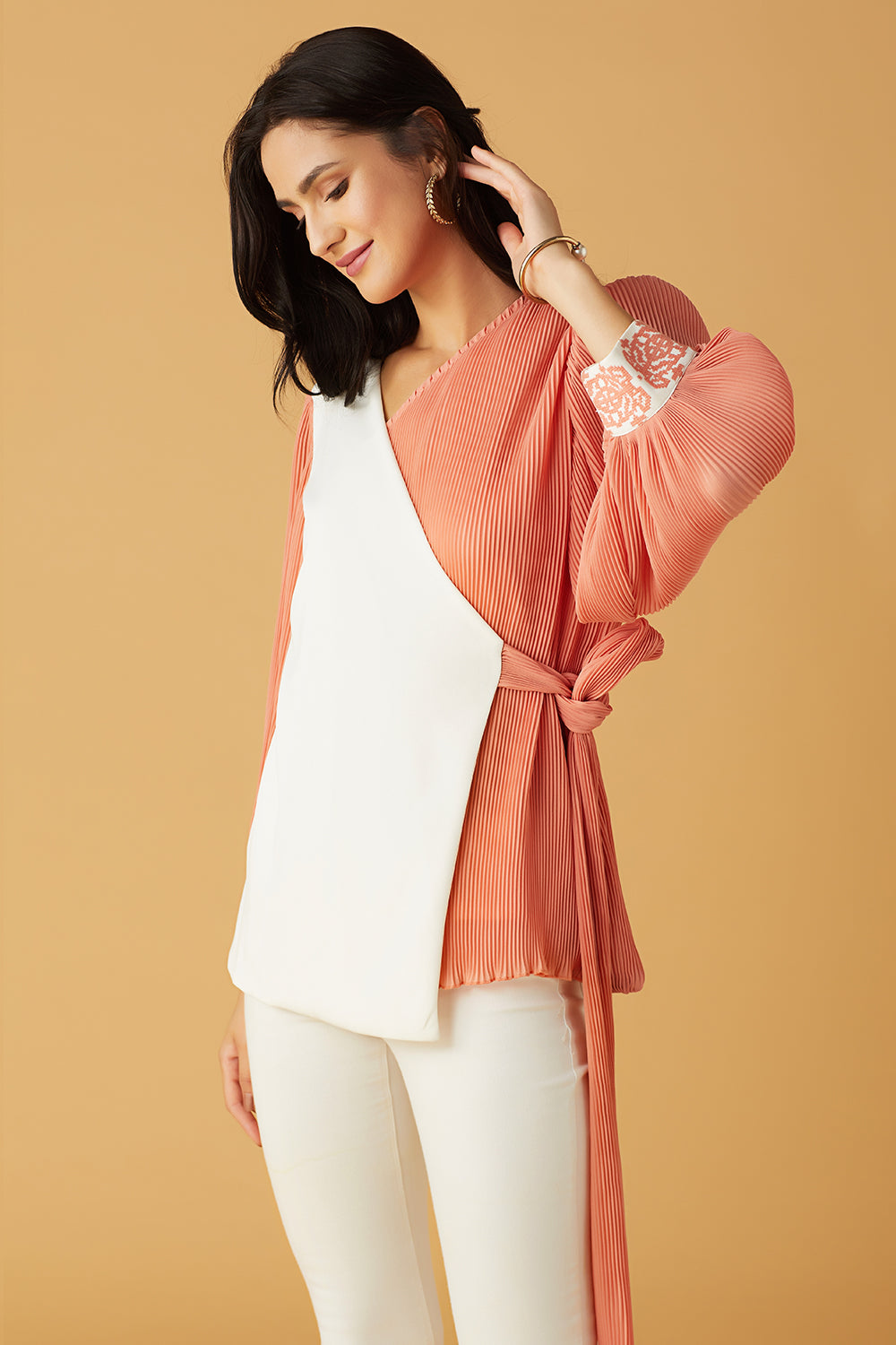 Featuring colour block wrap top with pleated Georgette sleeves. Its aesthetic is evidenced in its attention to both contemporary and traditional details from textural elements to intricate embroidery