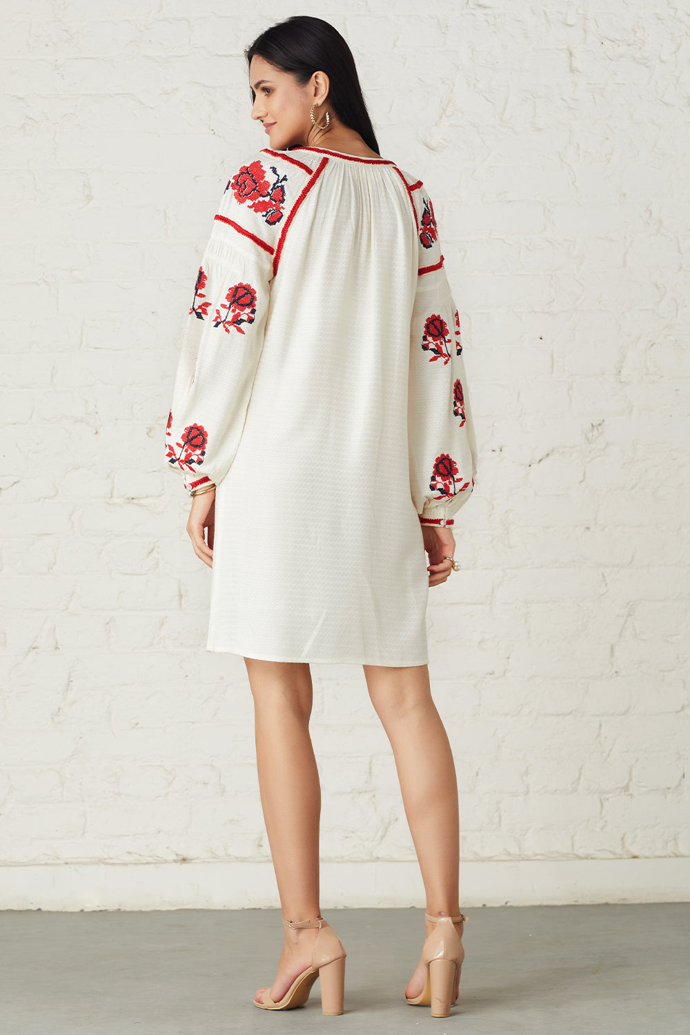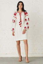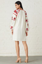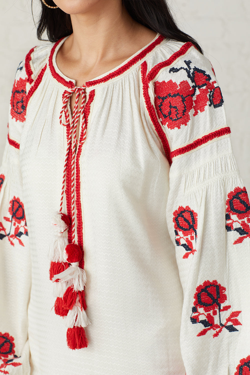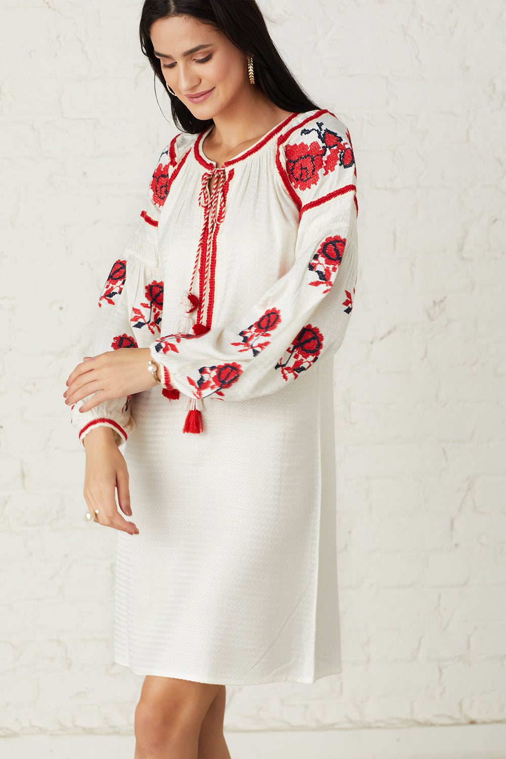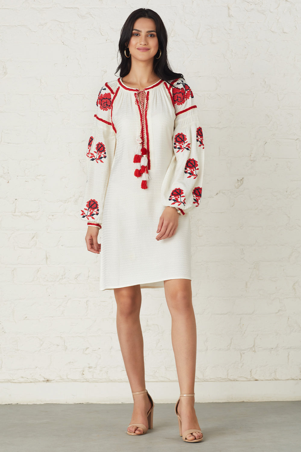 Embroidered floral bloom and lace detailing across the sleeves gives an enchanting finish. Tassels add a bohemian aesthetic to this striking dress.