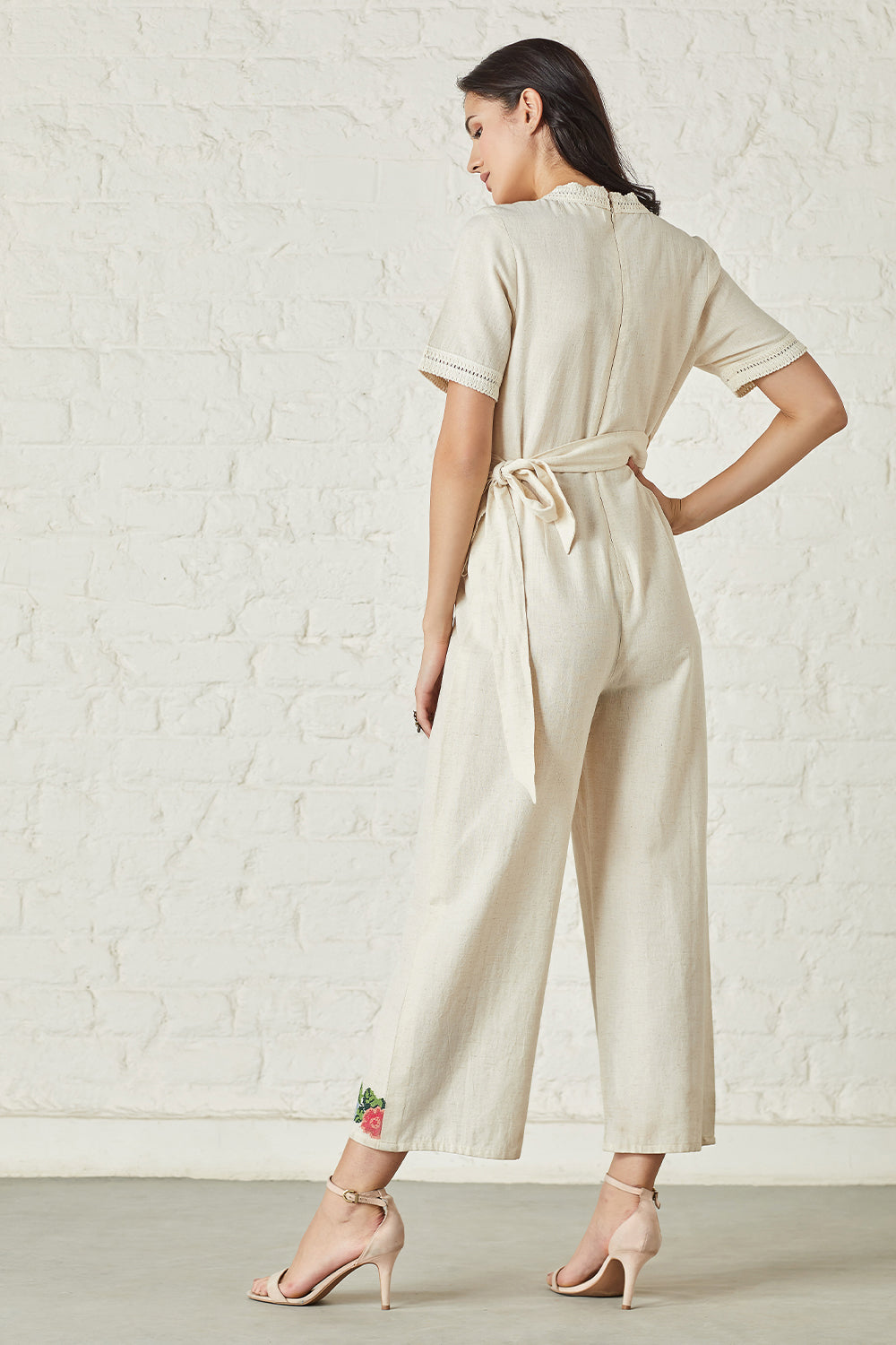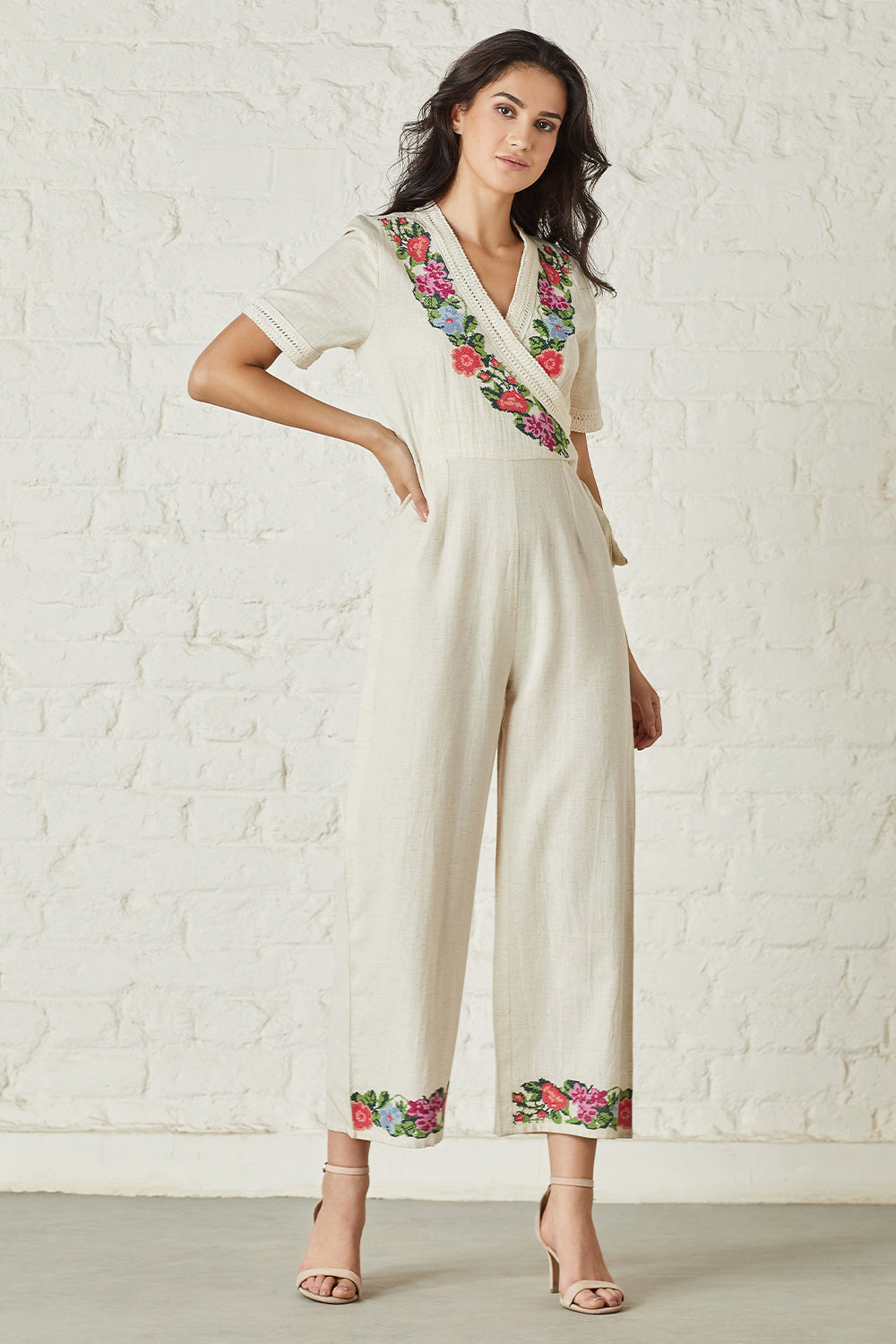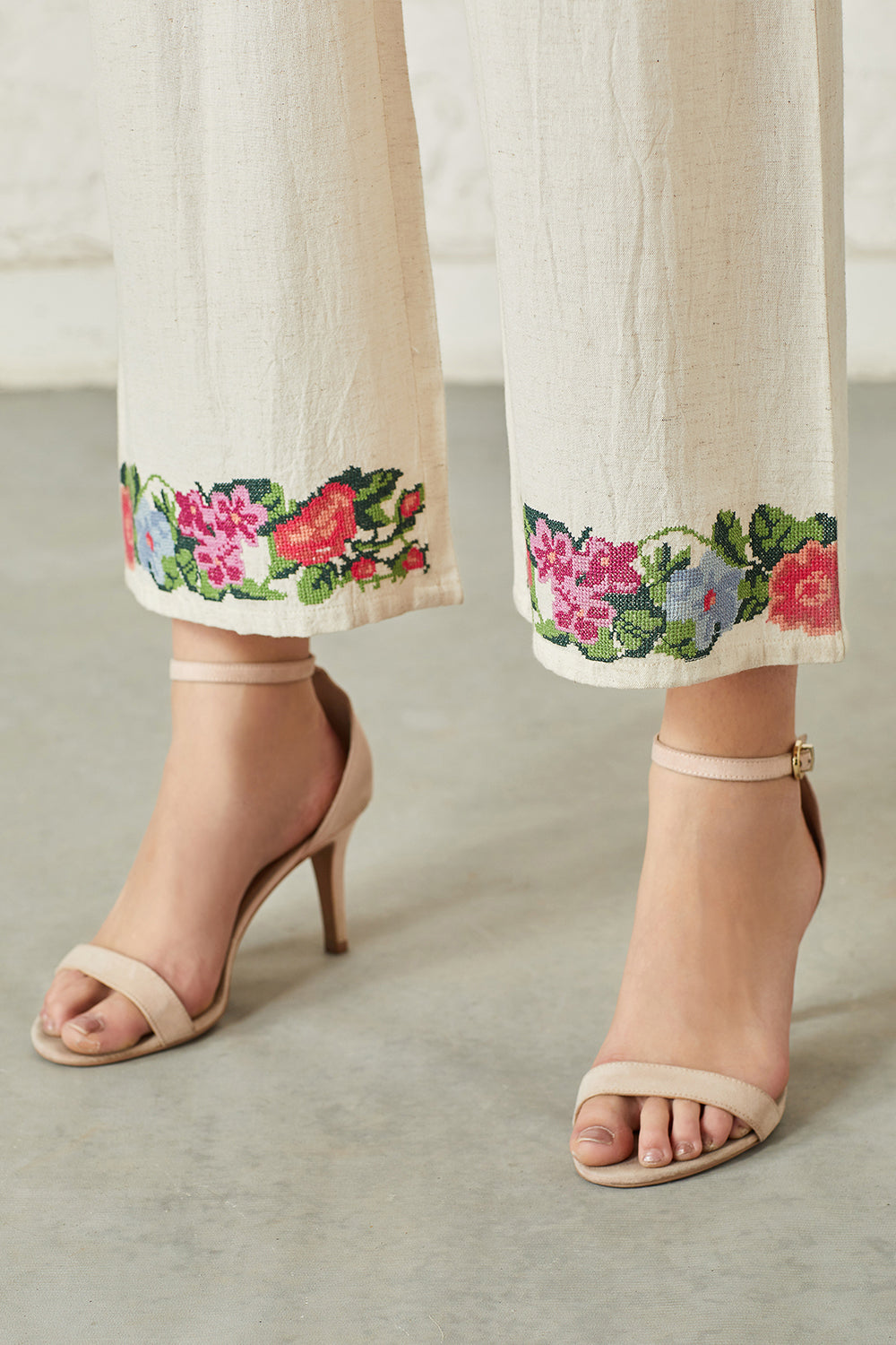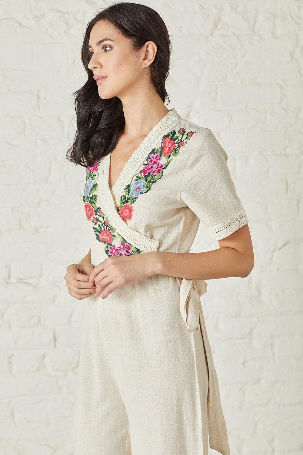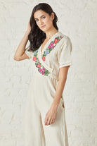 Vibrant colorful cross stich embroidered jumpsuit brings a cheery feminine twist to your day. Crafted with a spirt that is both simultaneously fashion -forward and vintage-inspired.