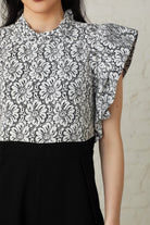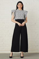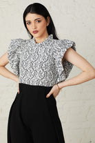 Flutter sleeved lace jumpsuit. The fit and flared silhouette gives a timeless specification.This collection is structured yet delicate.A presentation of beauty and strength.Flattering and exclusive