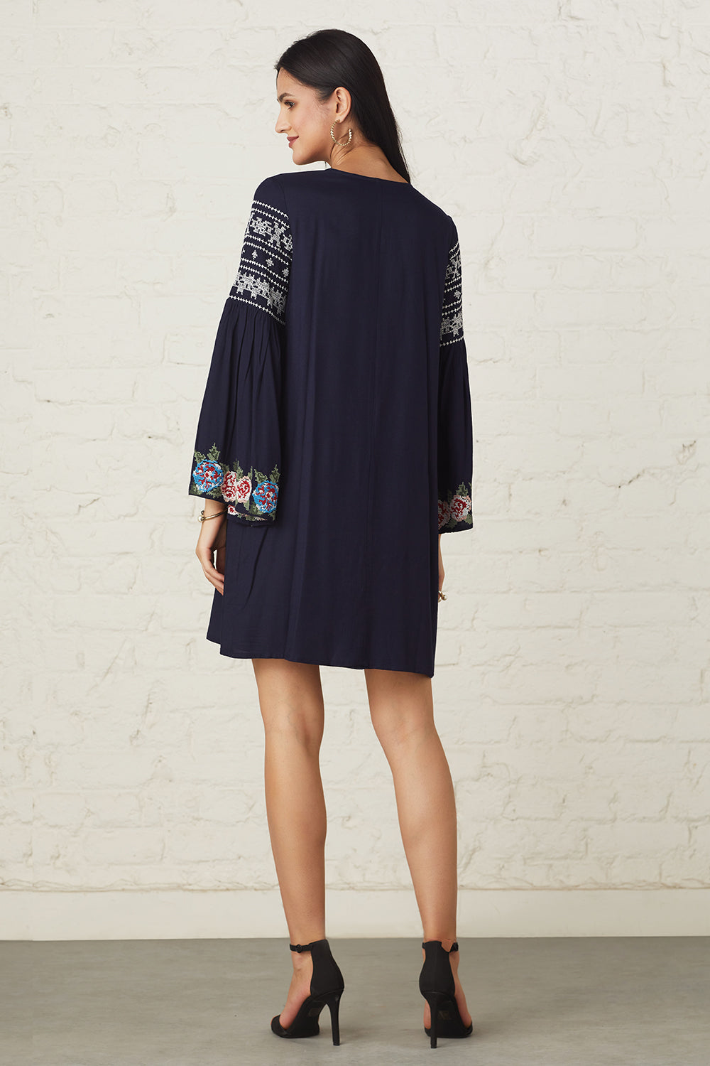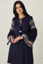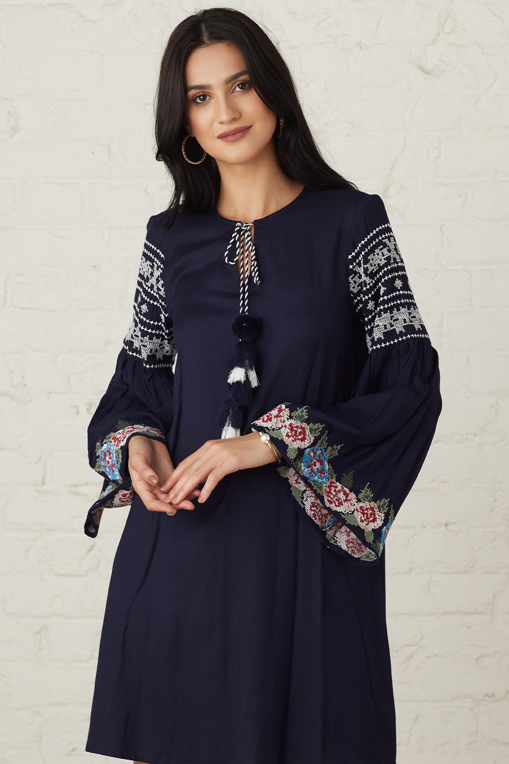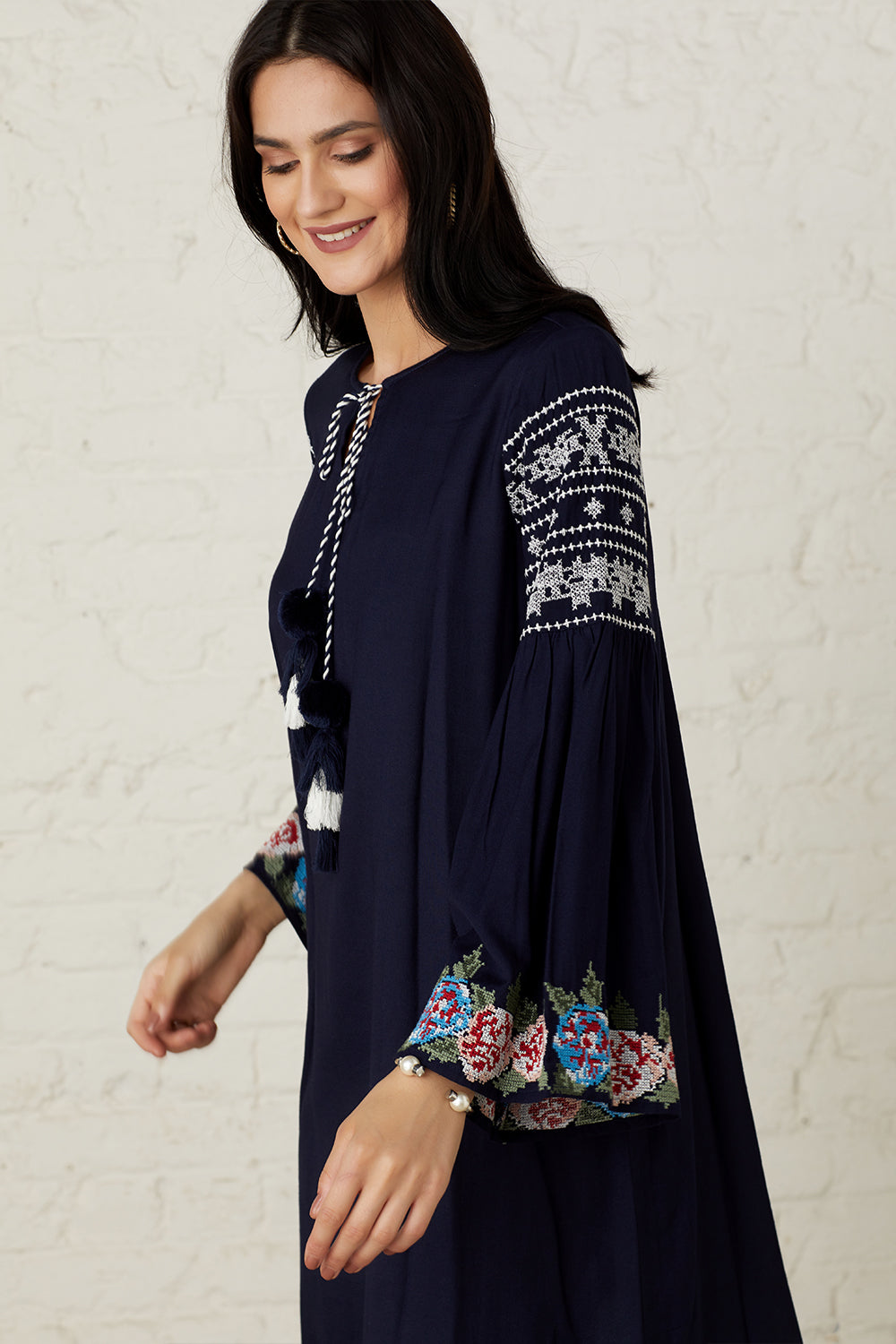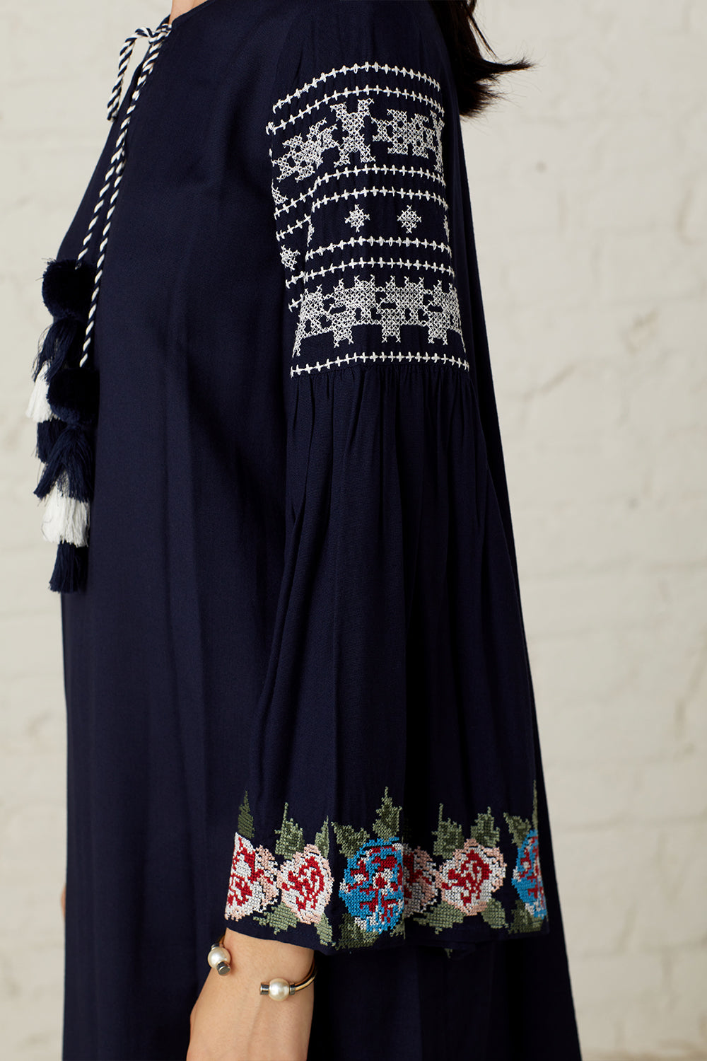 Eye catching cross stitch floral bloom embroidered dress is sure to be beloved. Pair it with your favorite flats for a breezy polished ensemble.