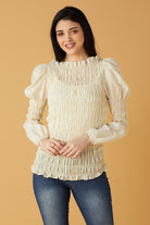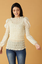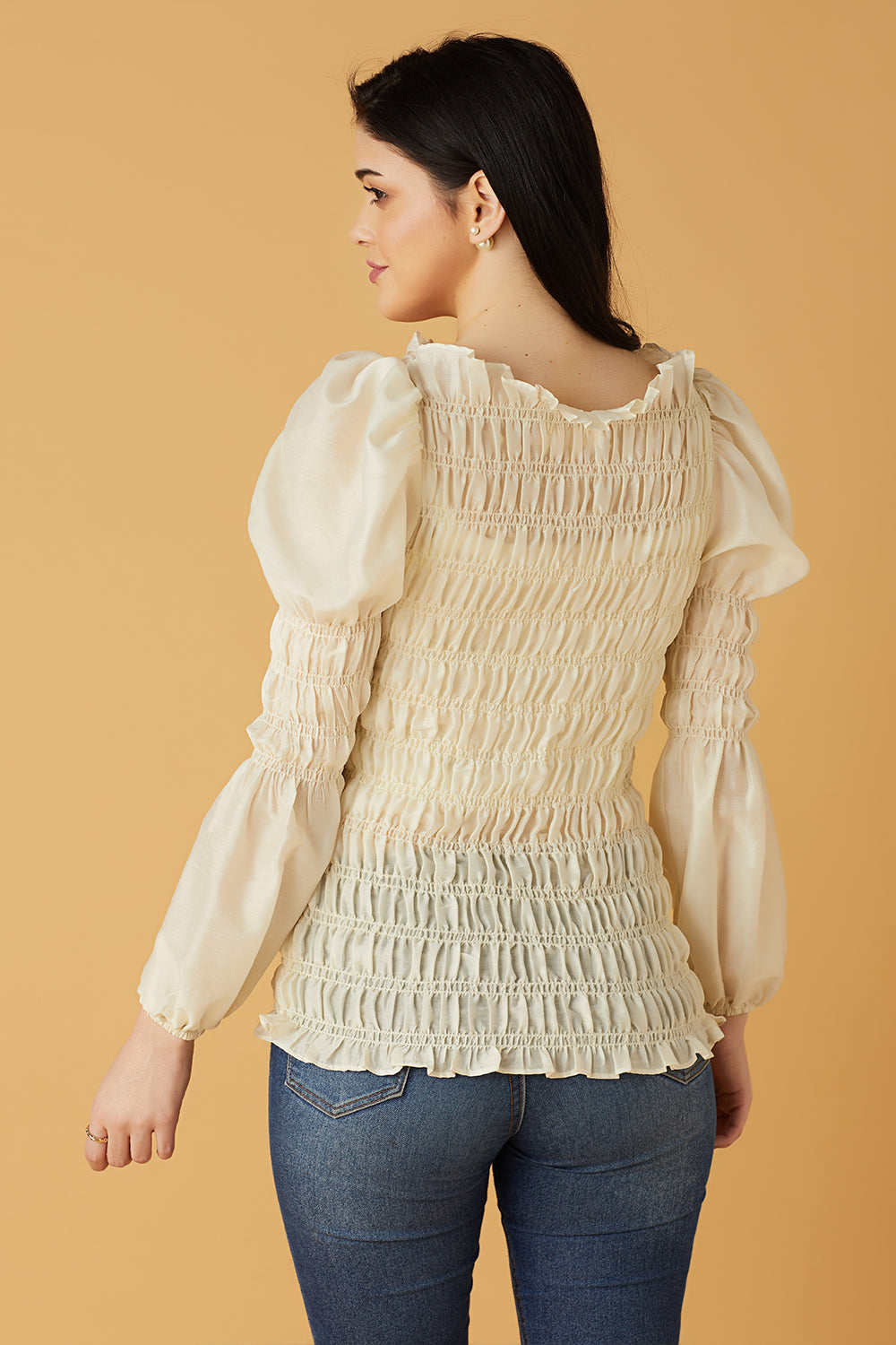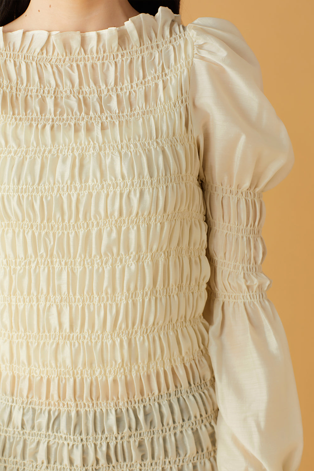 This blouse is structured yet delicate. A presentation of beauty and strength. Flattering and exclusive. Featuring smoked body and puff sleeves