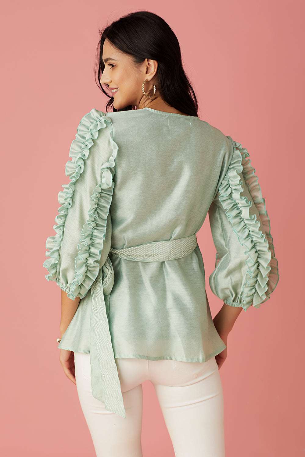 Featuring Chevron hand embroidered belt with exquisite ruffled sleeves .This collection is structured yet delicate, a representation of beauty and strength at once.