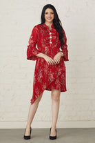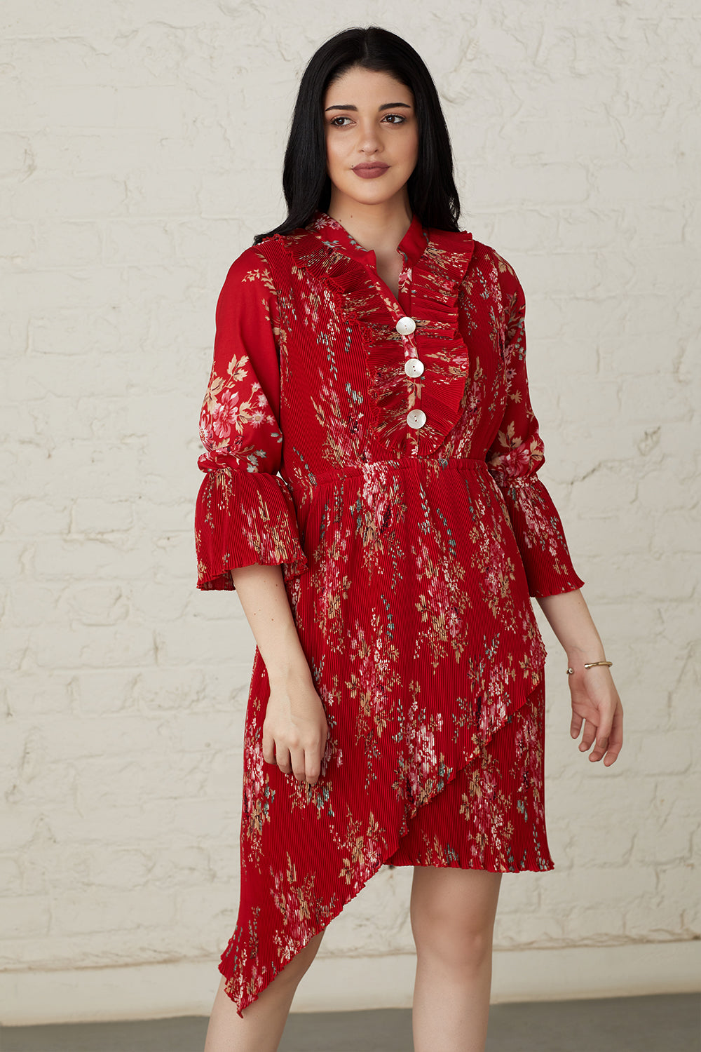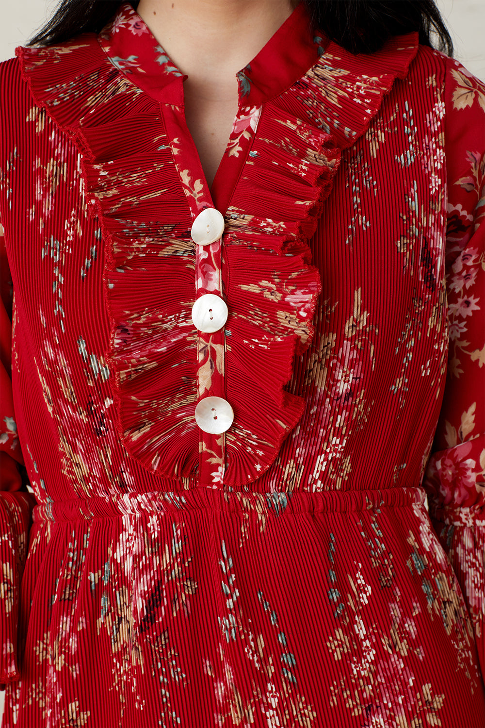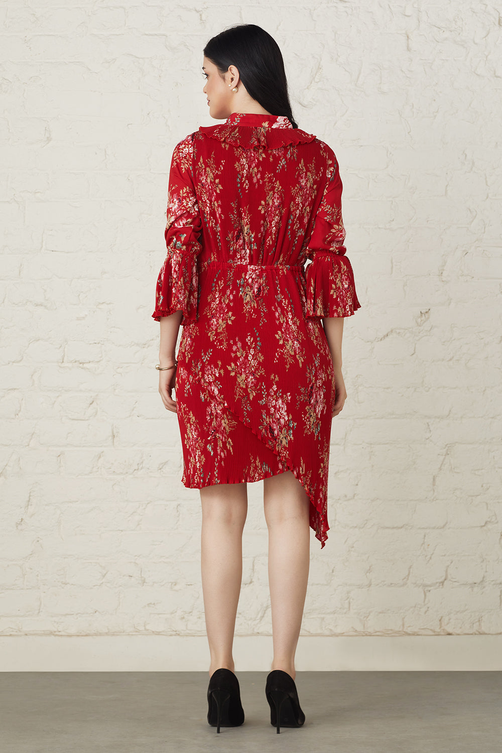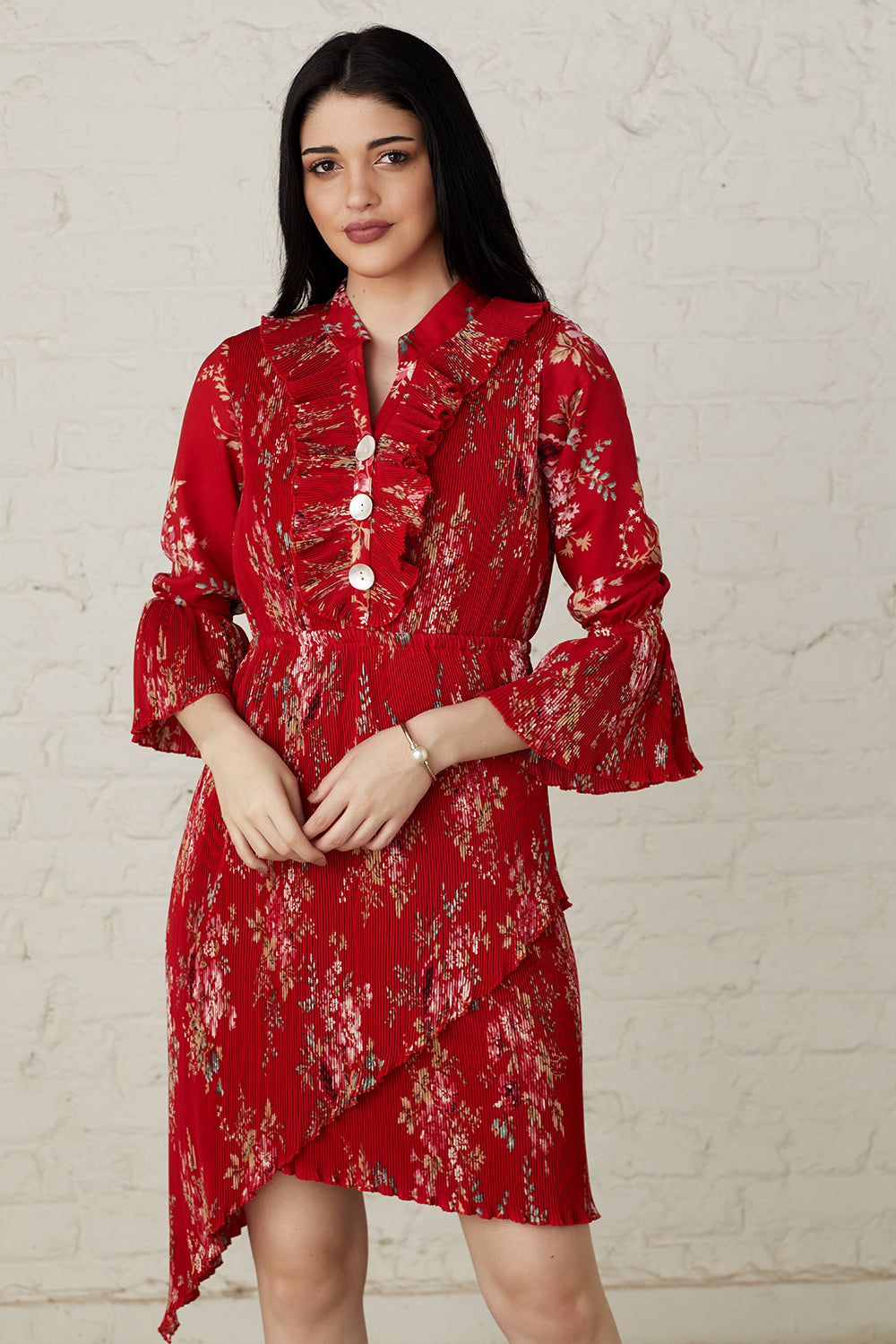 Precious pleated dress.Featuring an exquisite floral print with overlay flap and frills