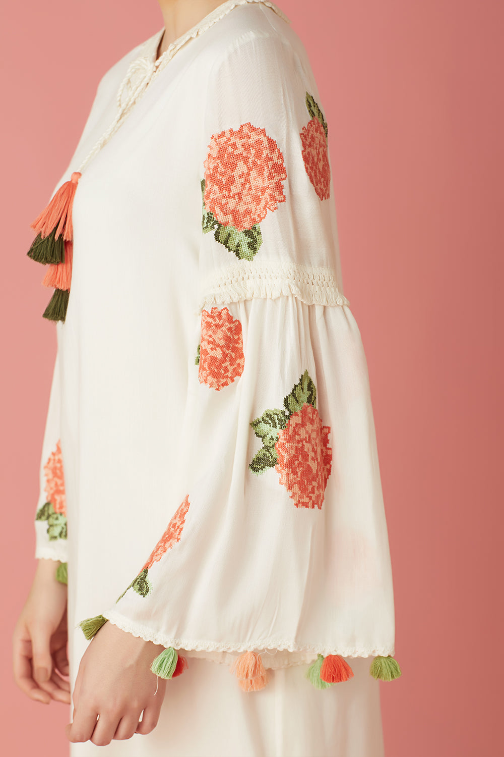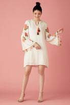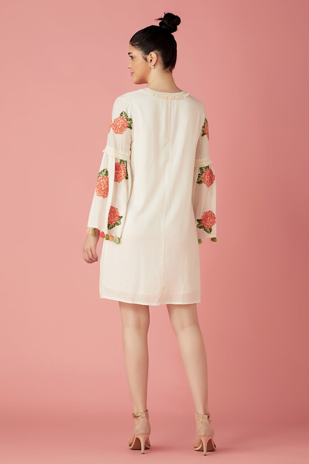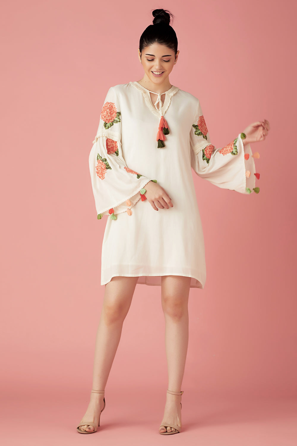Dreamy embroidered hydrangea bloom across the sleeves - granting a sweet feel you'll love.This dress with tassels gives it a bohemian finish.