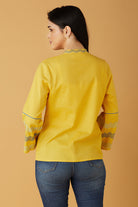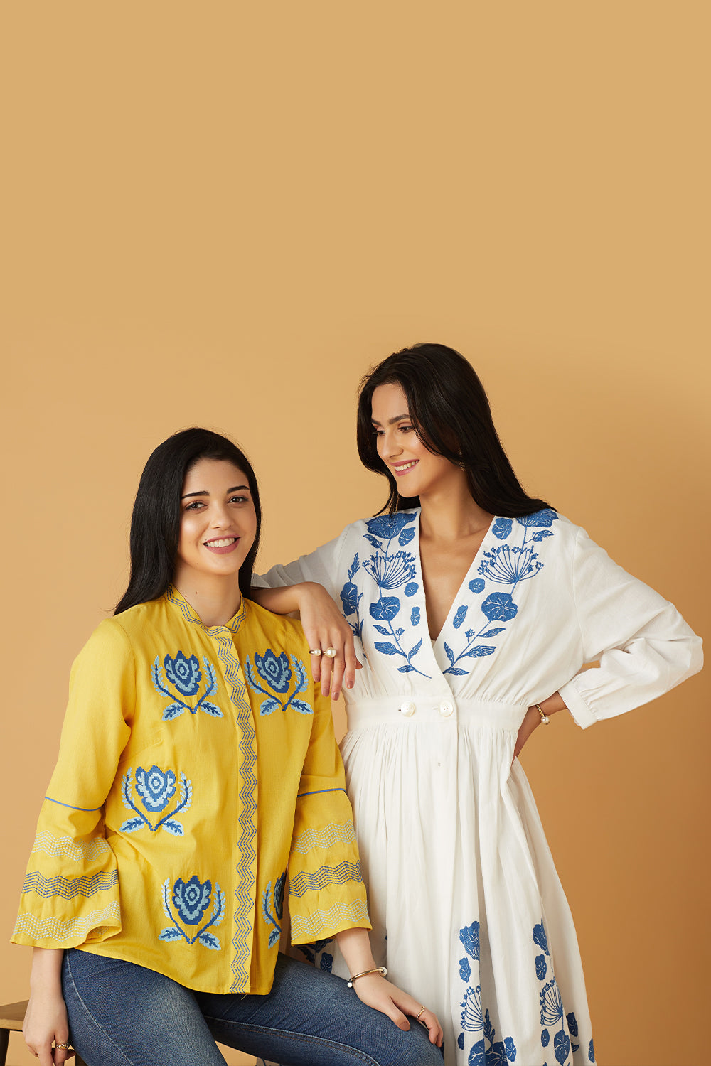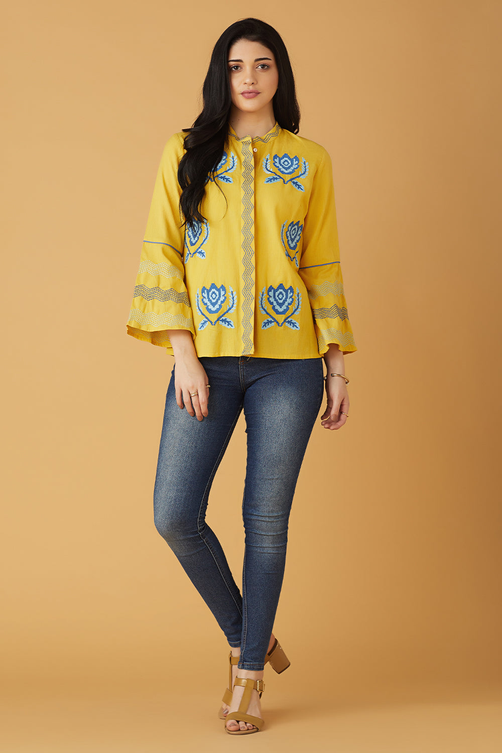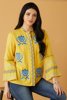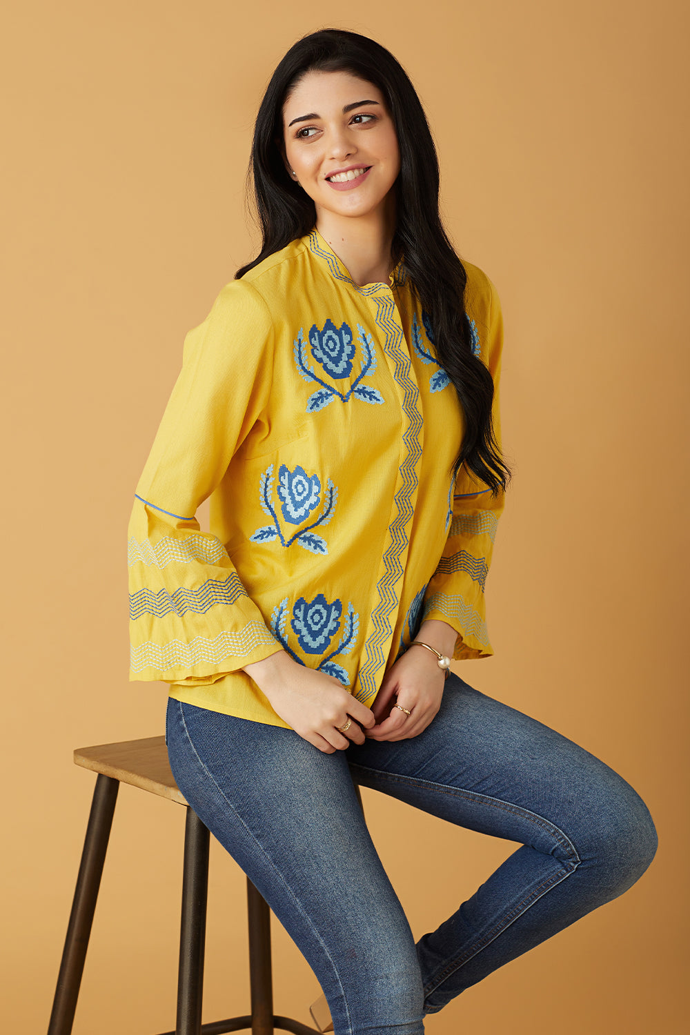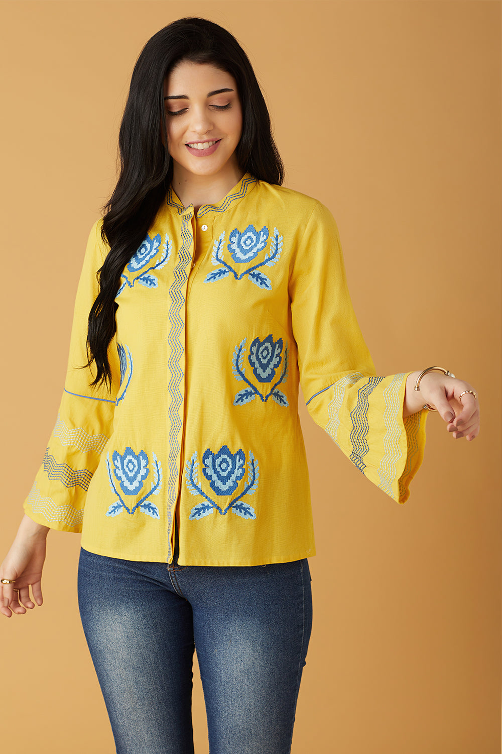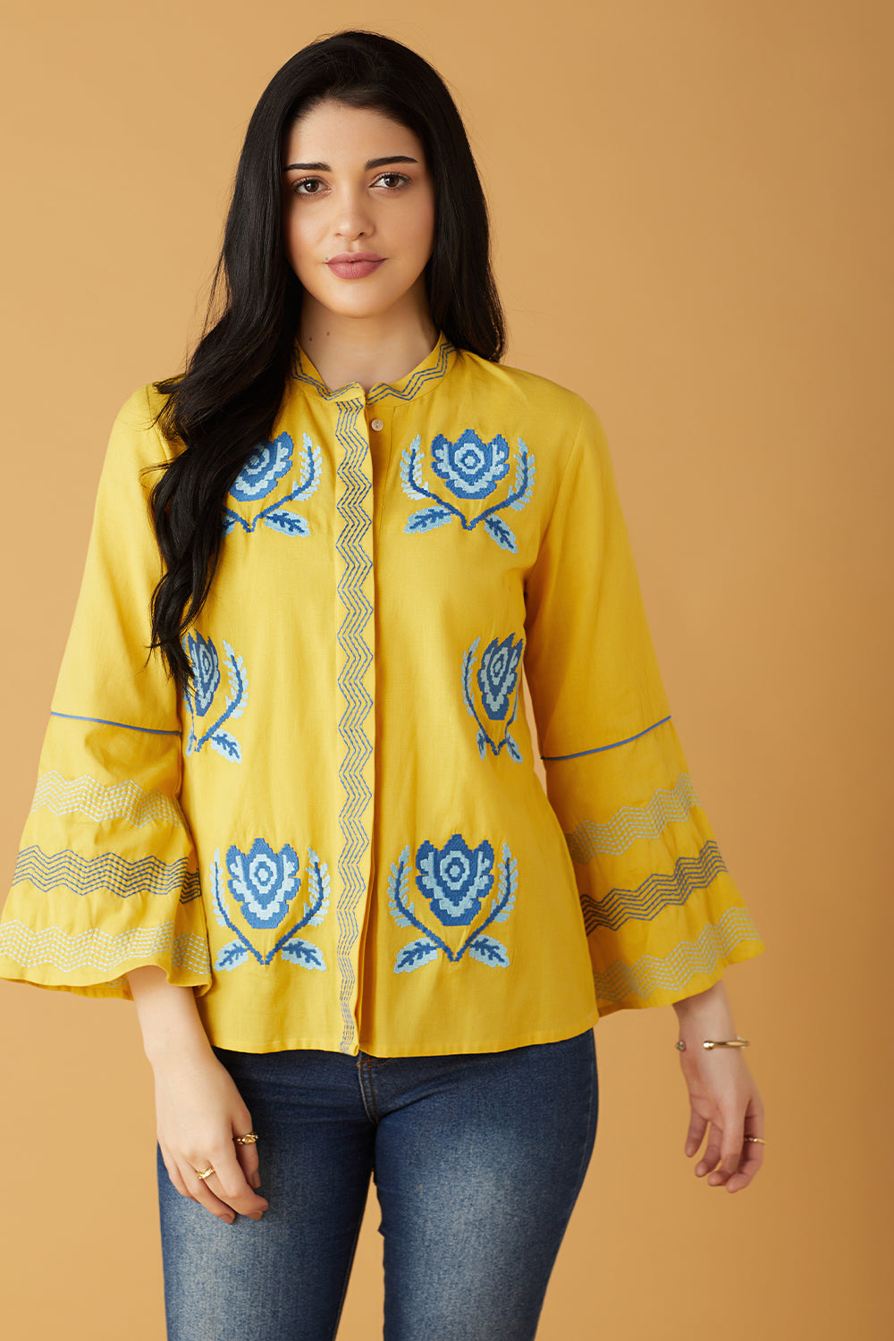 Fierce sunny yellow linen shirt. Featuring Intricately embroidered sleeves, neckline, and overall exquisite floral embroidery. A staple for the summers.