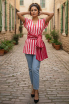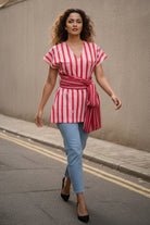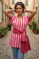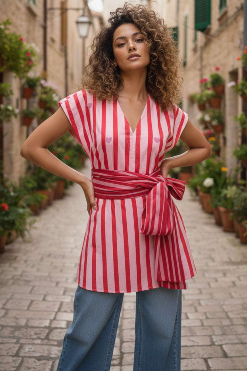 Crafted in stripped poplin hand embellished hearts and a wrap bow tie.