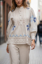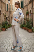 Crafted in natural linen and exquisite honeycomb bird embroidery this coord set is drop dead gorgeous.