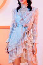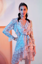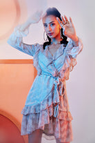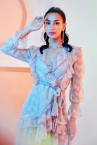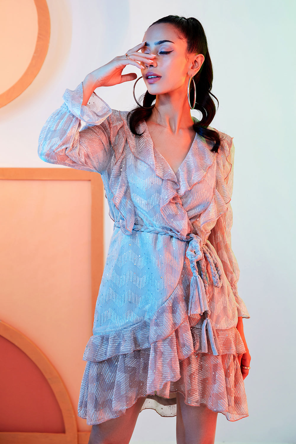 Drop dead gorgeous wrap dress with ruffle details and braided belt. Our absolute favourite. Crafted in metallic chevron its an event ready ensemble.