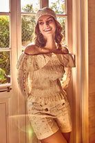 This off the shoulder broderie blouse features a smoked bodice and broderie sleeves crafted in premium cotton. Paired with matching shorts is a perfect summer friendly brunch outfit.