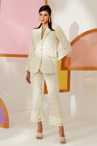This set is made in broderie includes button front blazer and fully lined with sustainable bamboo cotton. Pants are half elasticated with cutwork embroidery.