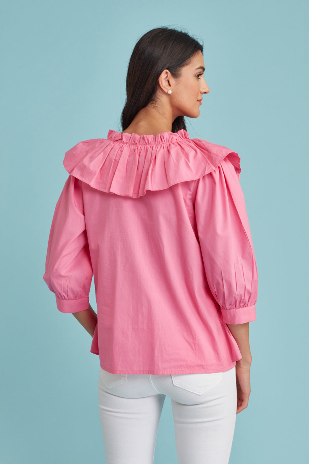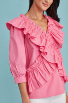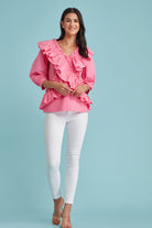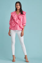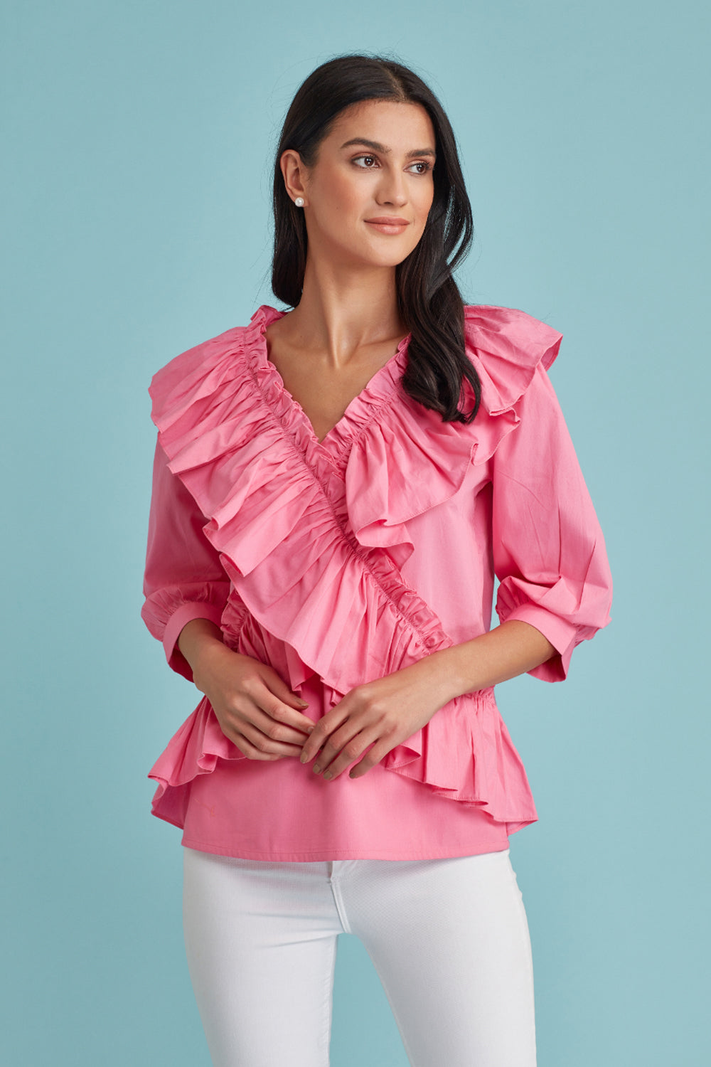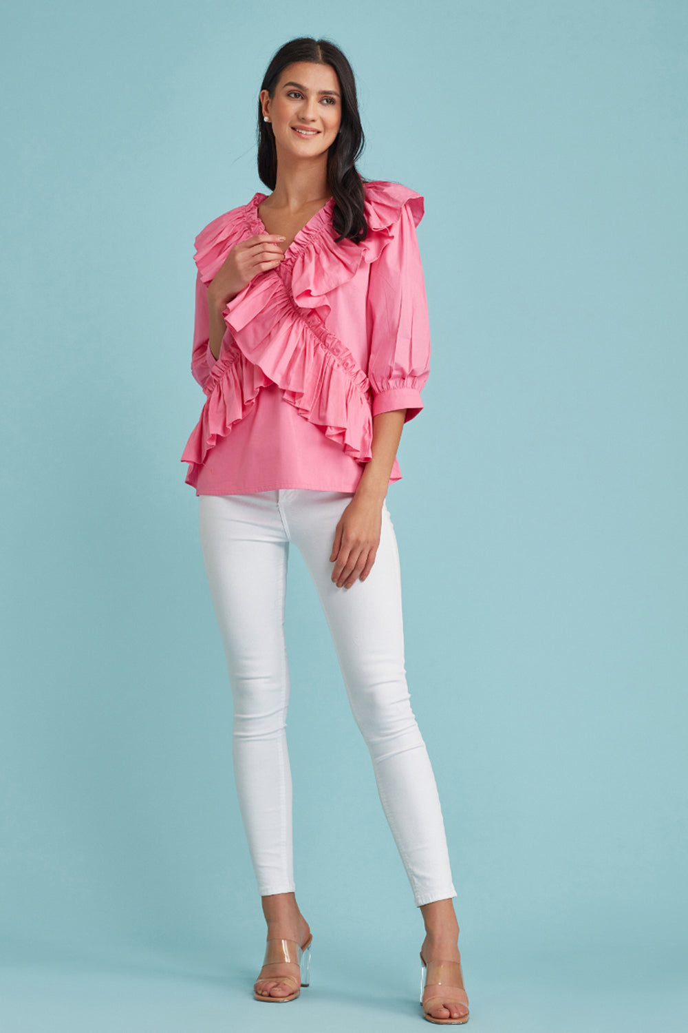 Feminine and fashion forward ,this ruffled blouse puts a dainty twist on everyday denim, trousers or culottes