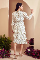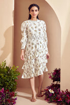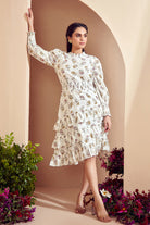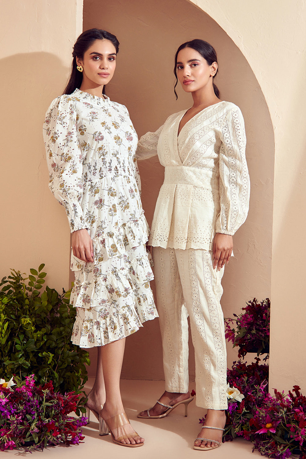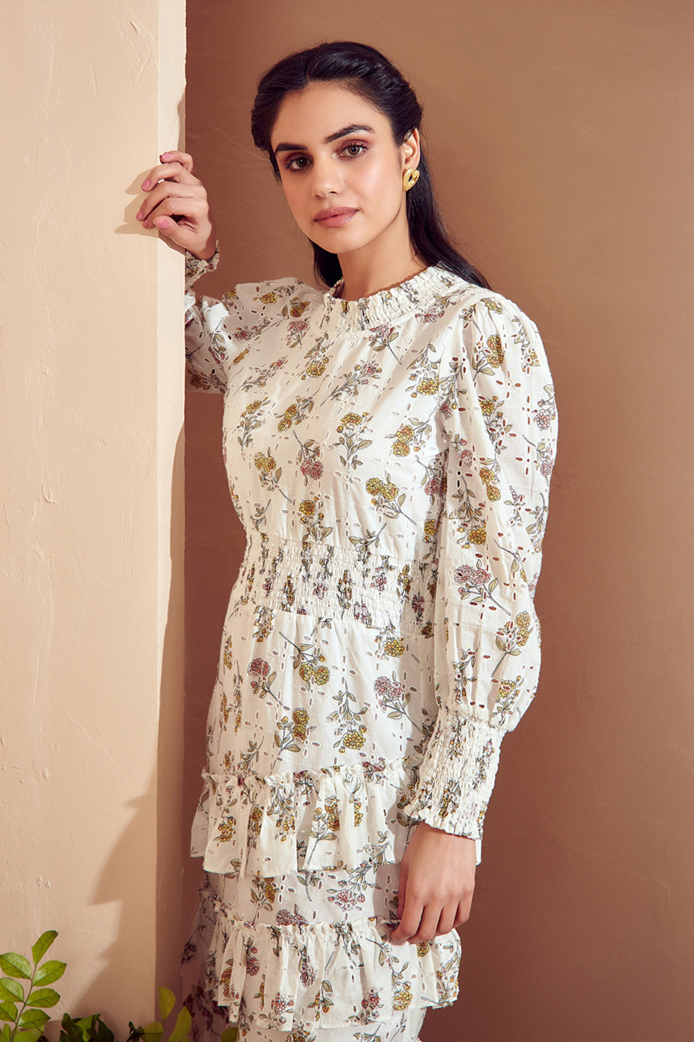 Beautiful broderie printed dress,Featuring frills, smoked sleeves ,waistline and asymmetric hemline. We love sporting its pastel hues for sunny days and evenings.