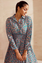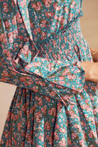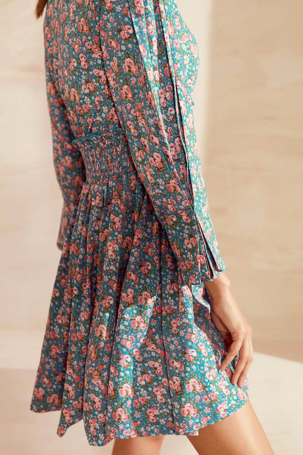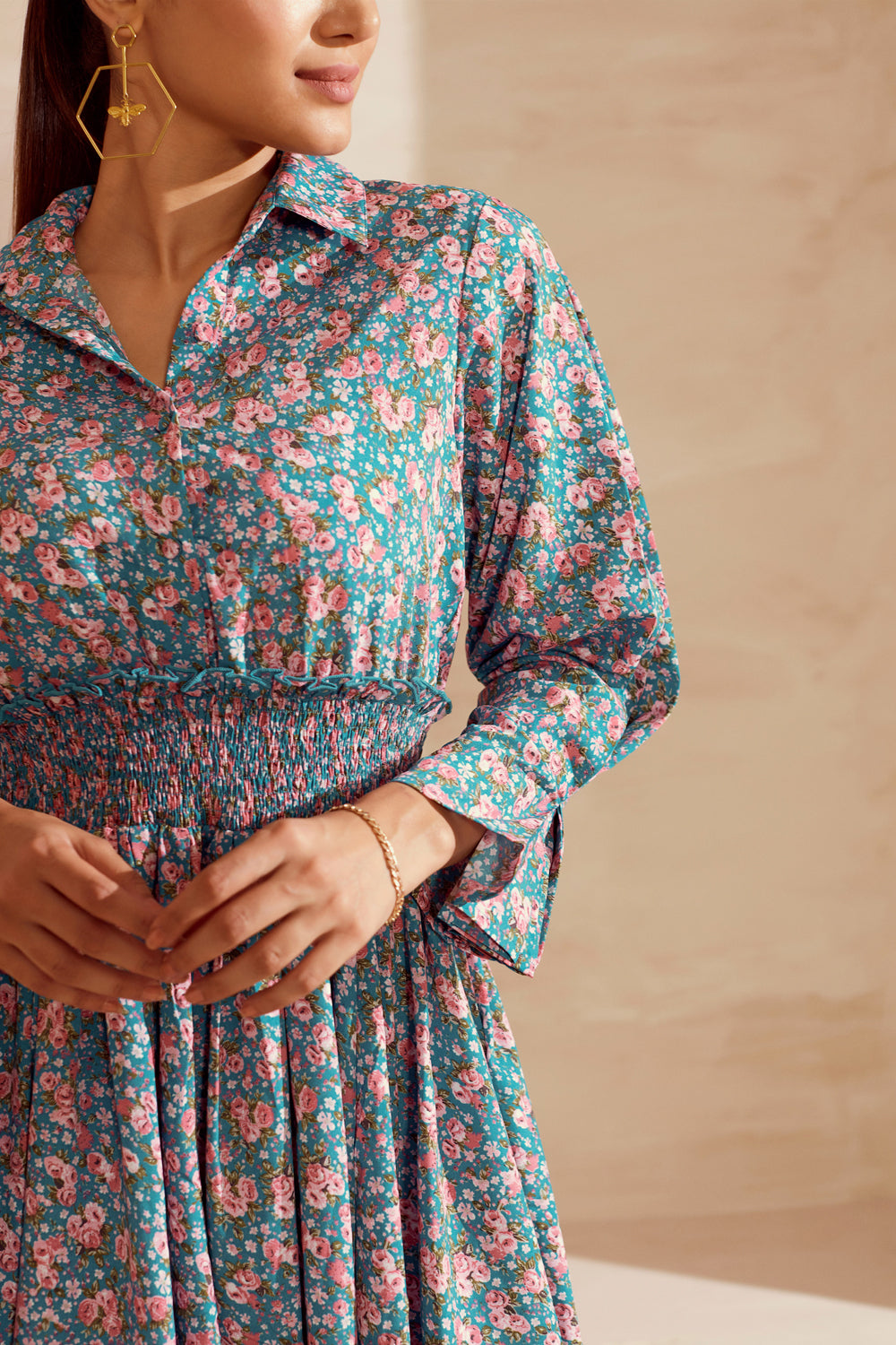 Flattering and versatile. Featuring a smoked waistline and detailed sleeves. The dress is structured yet delicate.