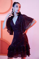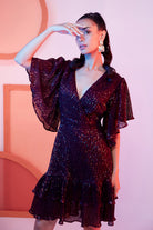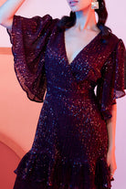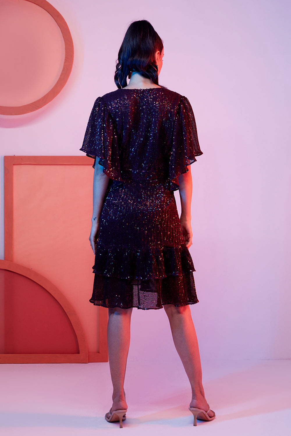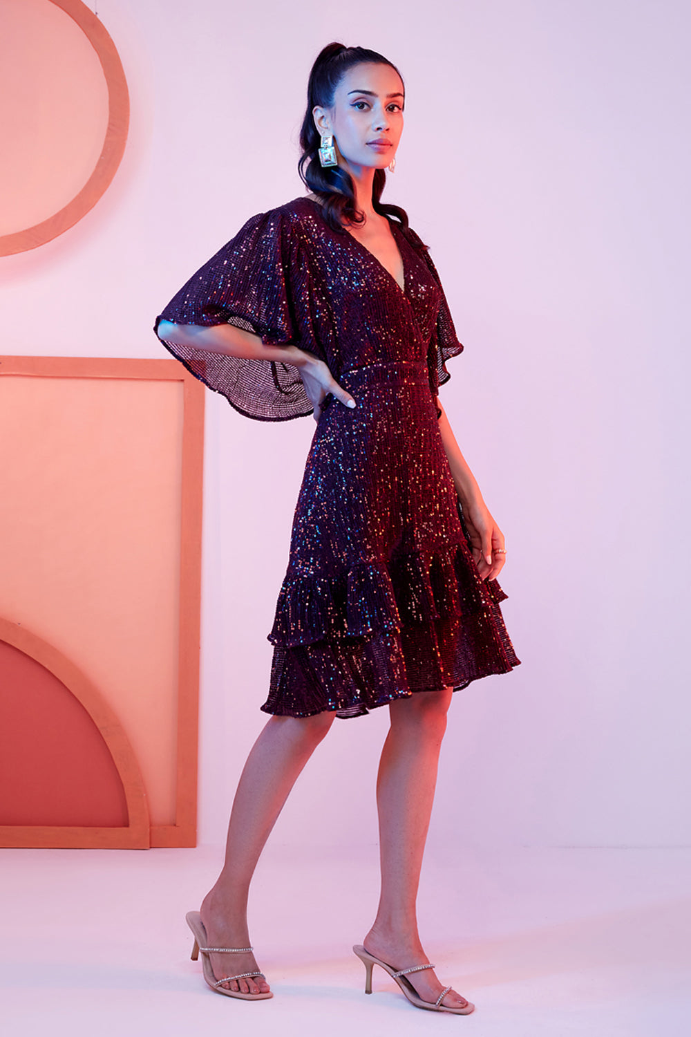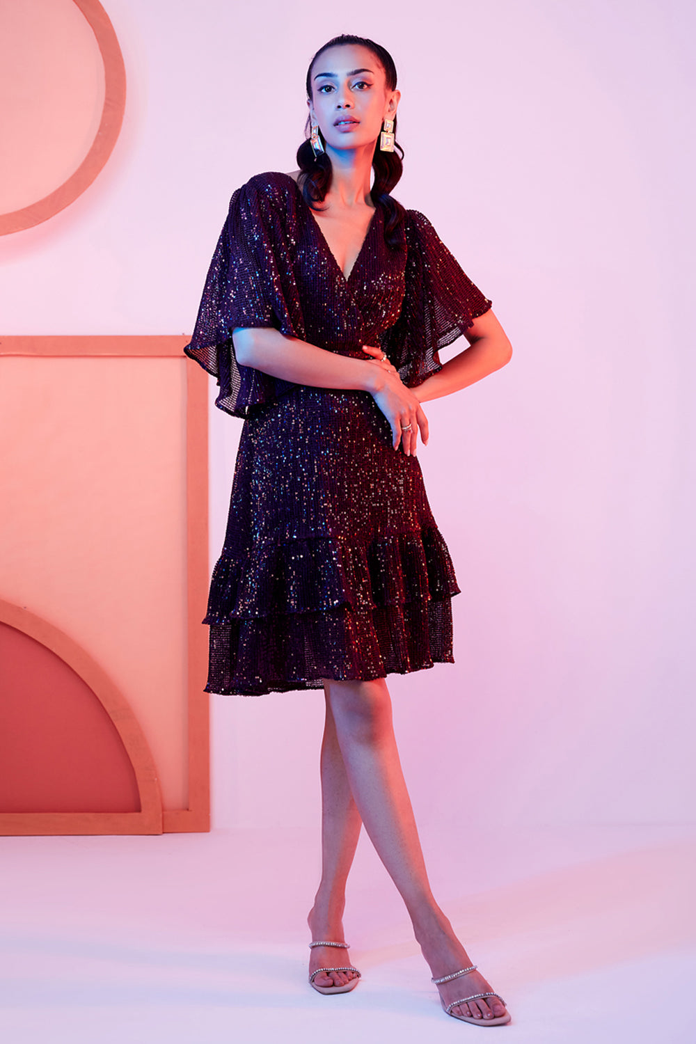 This beautifully crafted sequinned dress featuring gathers, ruffles and striking sleeves makes the dress a heads turning statement.