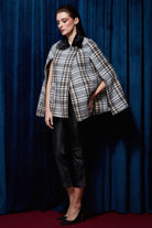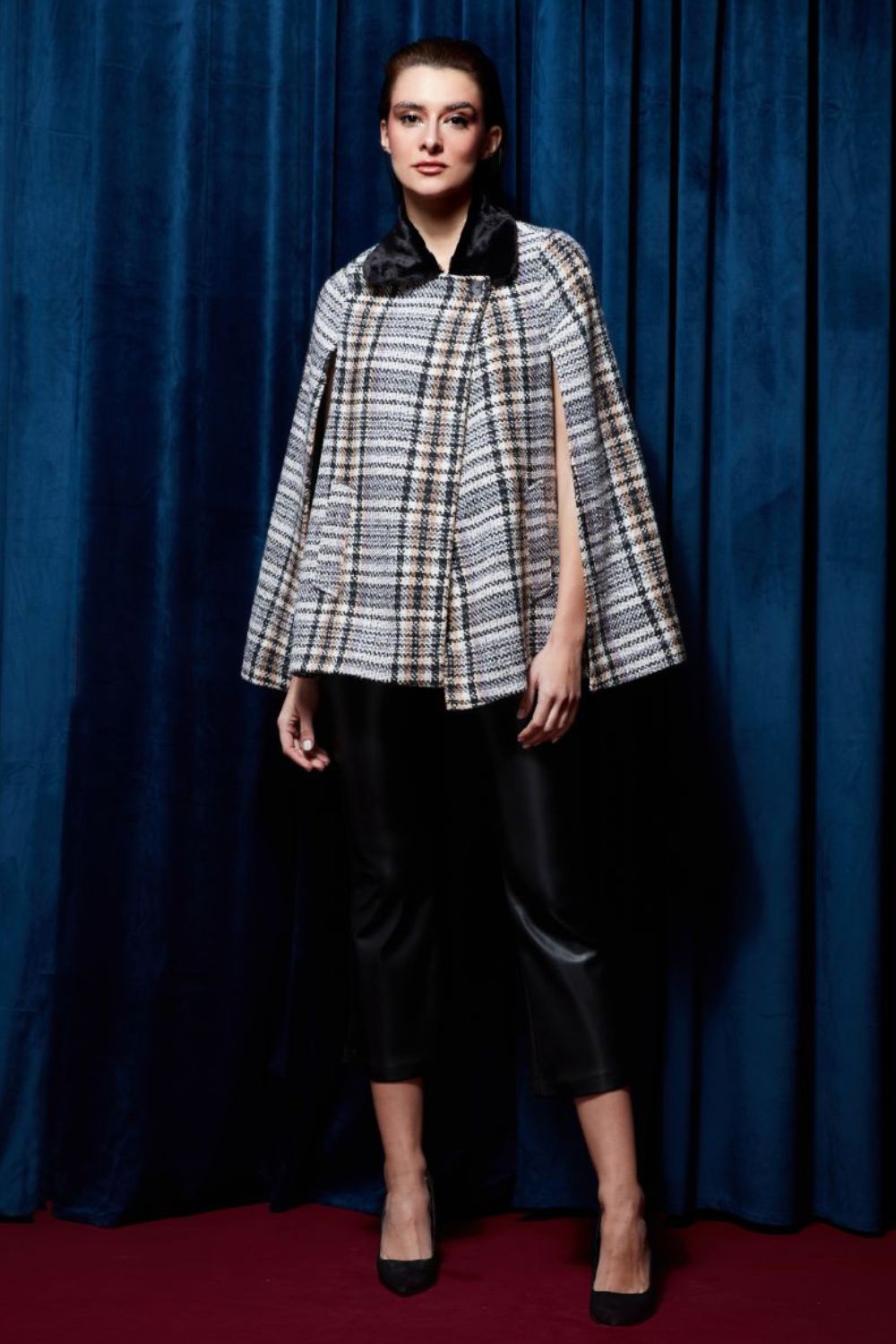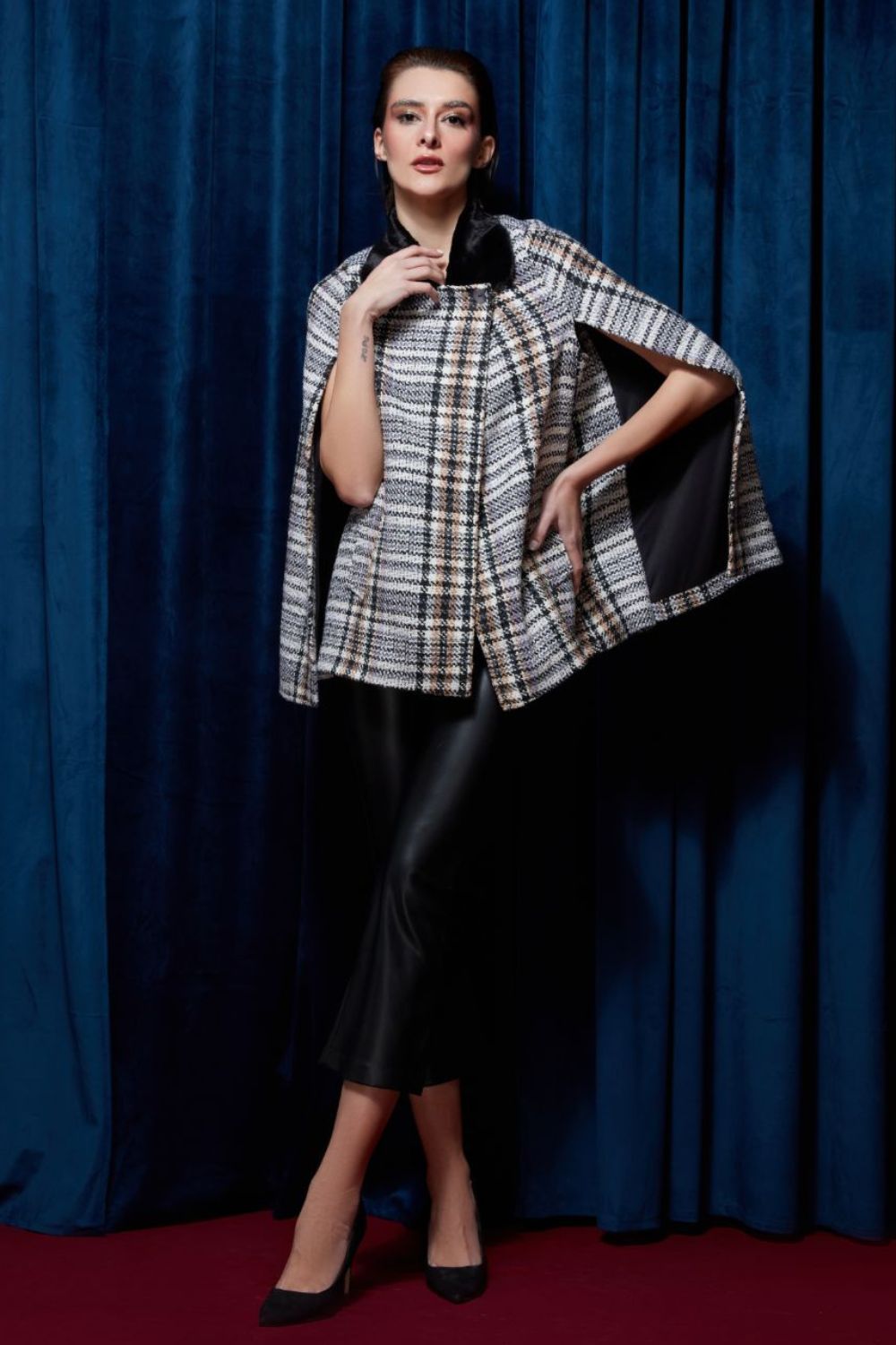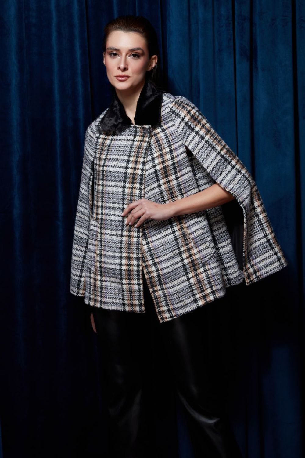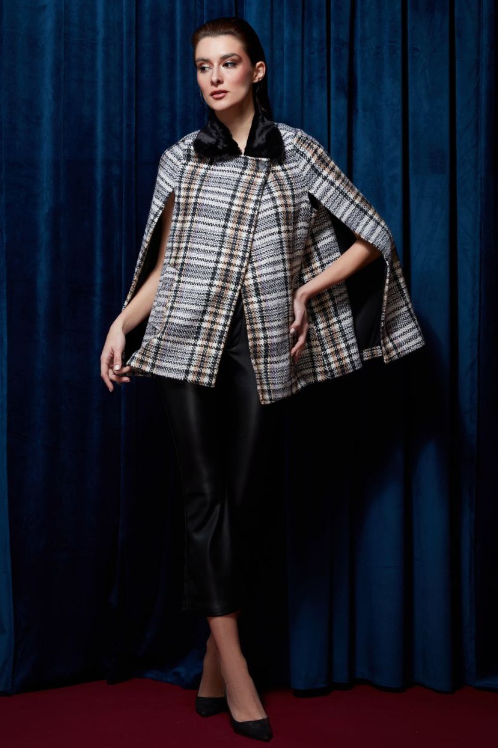 Metallic Tweed cape coat detailed with a fur collar.Perfect for winter brunches.