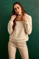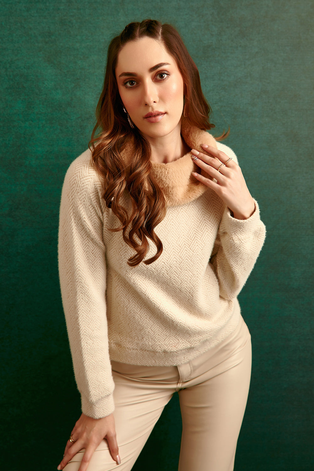 Premium woollen knit with herringbone pattern and a cowl neckline ,lined with a contrast soft woollen fabric.