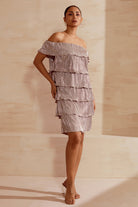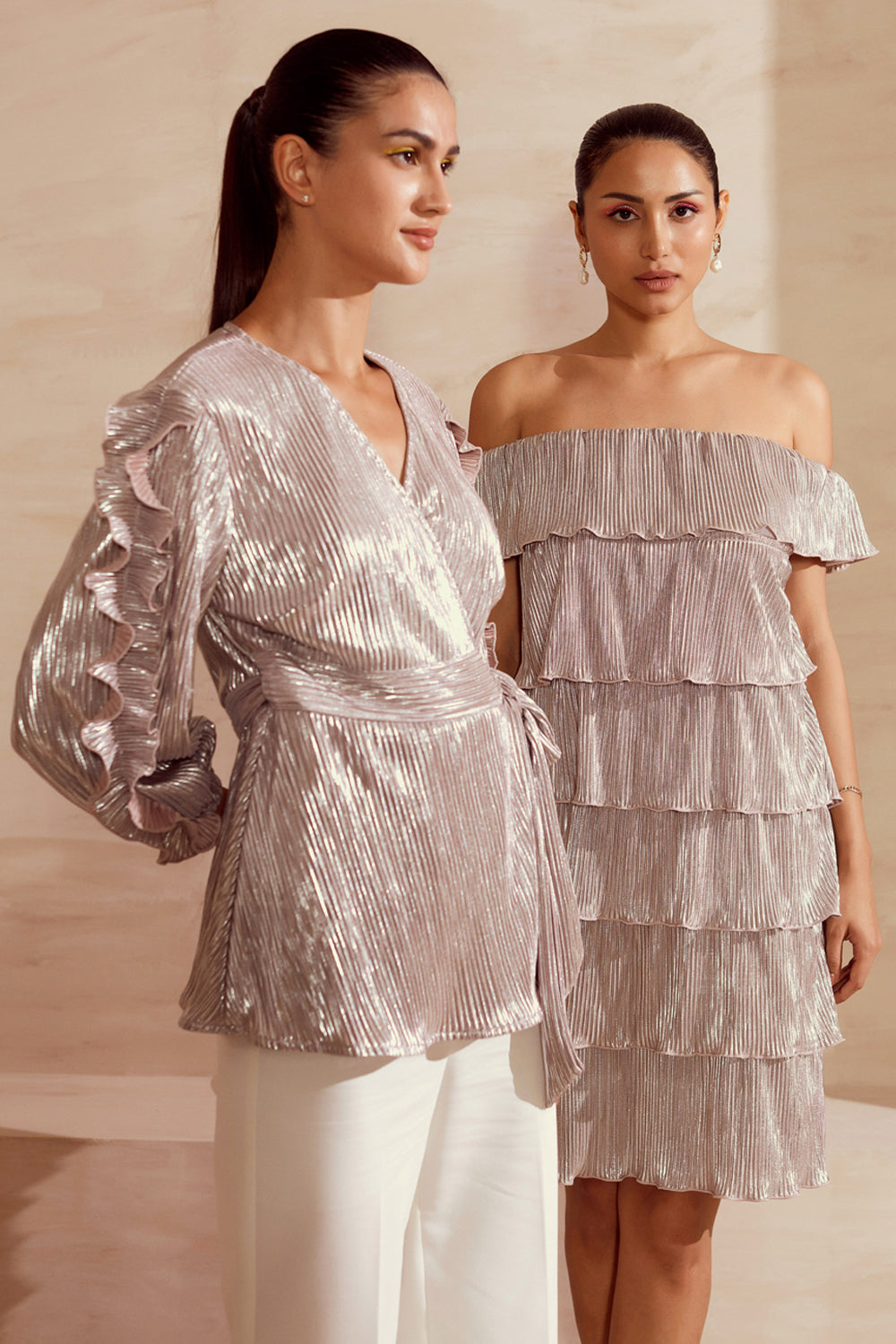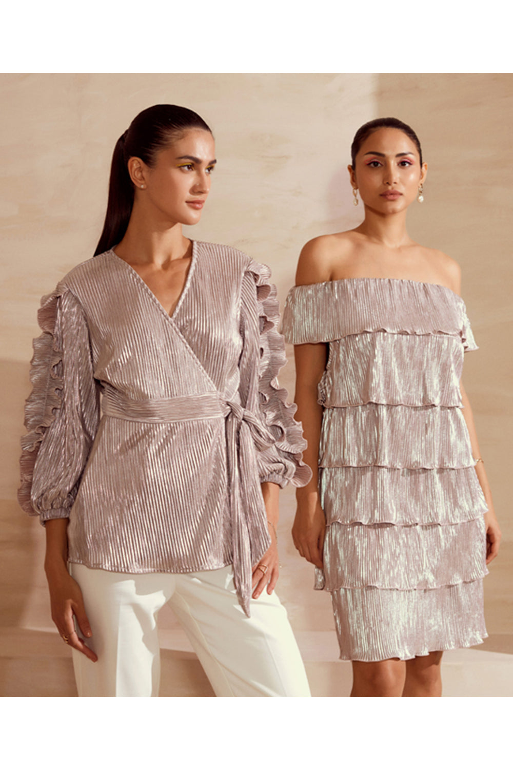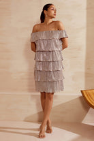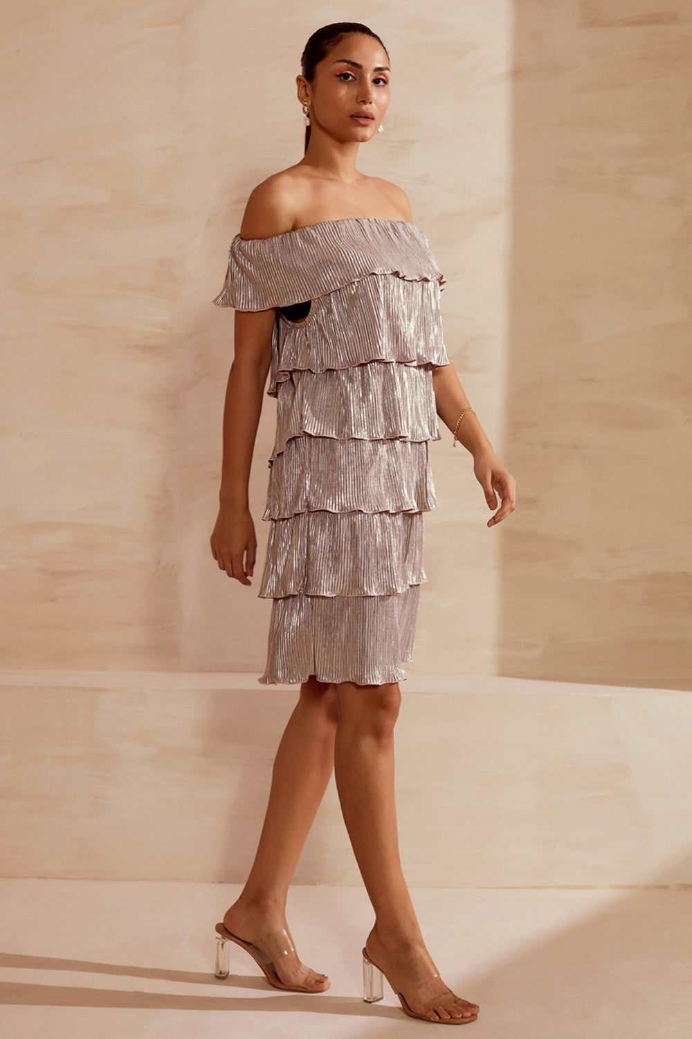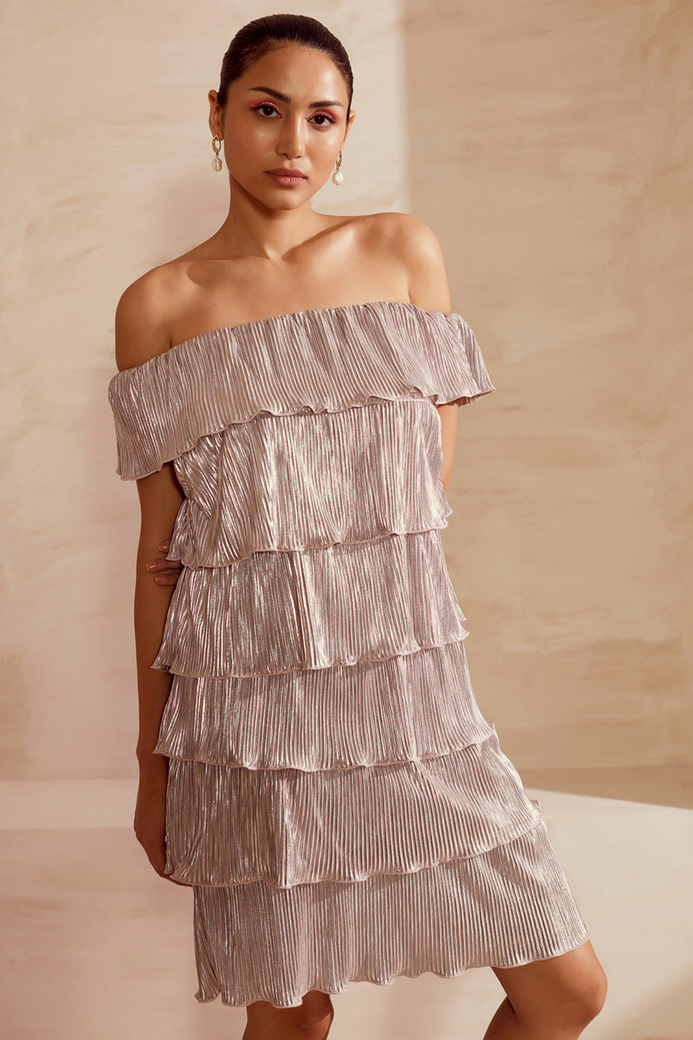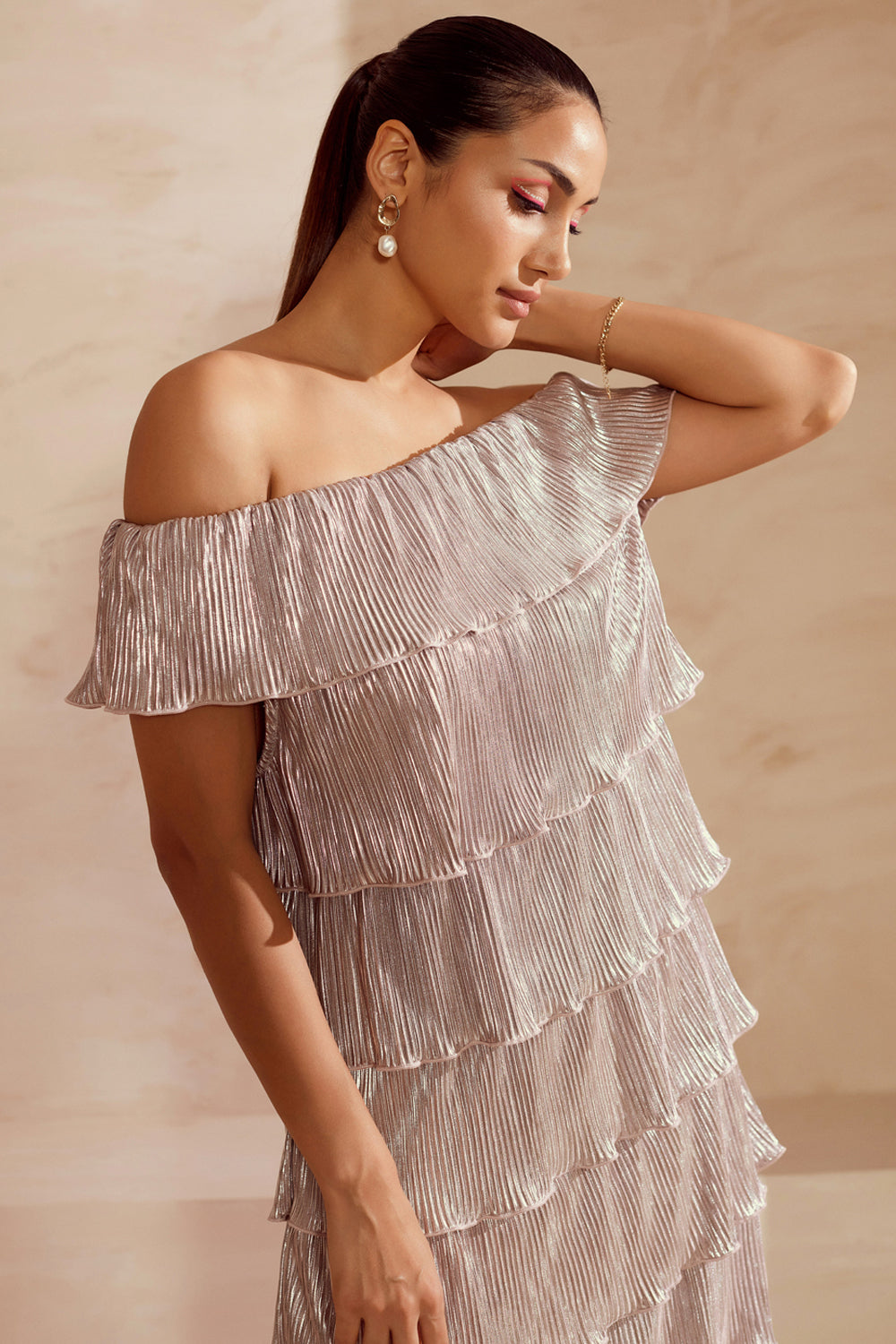 Oh so-so polished pleats, this off the shoulder dress is a feminine essential. This silhouette appeals to the understated feminity of the modern women.